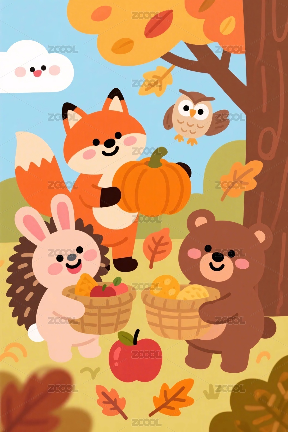 小动物,兔子,刺猬,狐狸,猫头鹰,苹果,南瓜,秋日,森林,插画