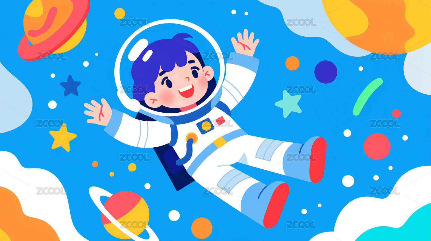 宇航员,男孩,卡通,外太空,行星,云朵,星星,橙色,太空服,漂浮