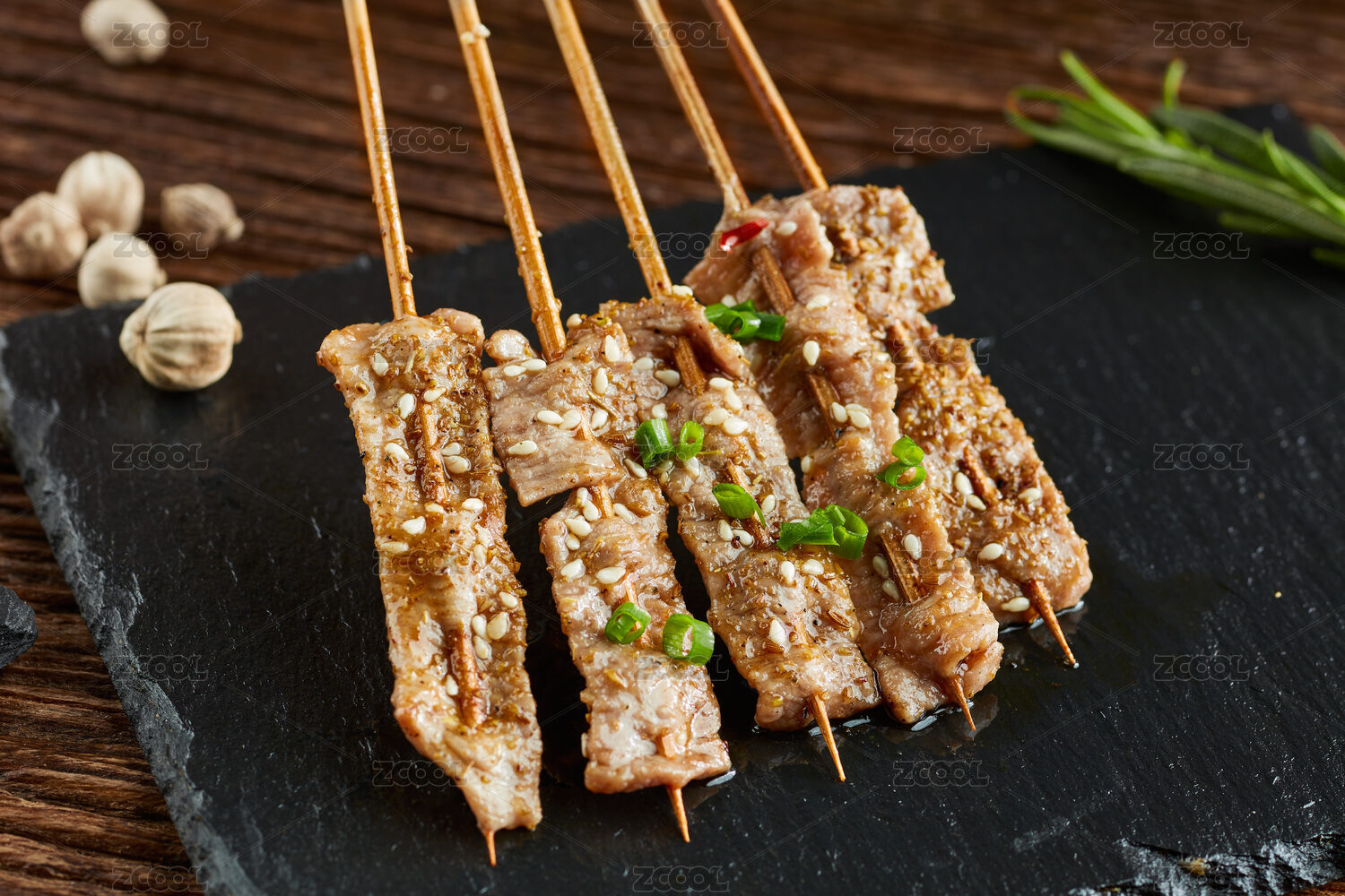 暗色木纹桌面上放着一盘烤熟的牛板肠串