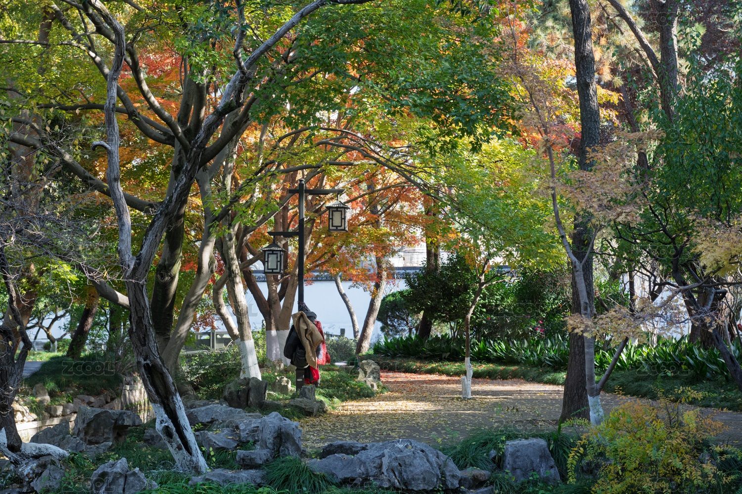 秋天中国安徽省蚌埠市张公山公园景区里的色木槭树和枫叶落叶