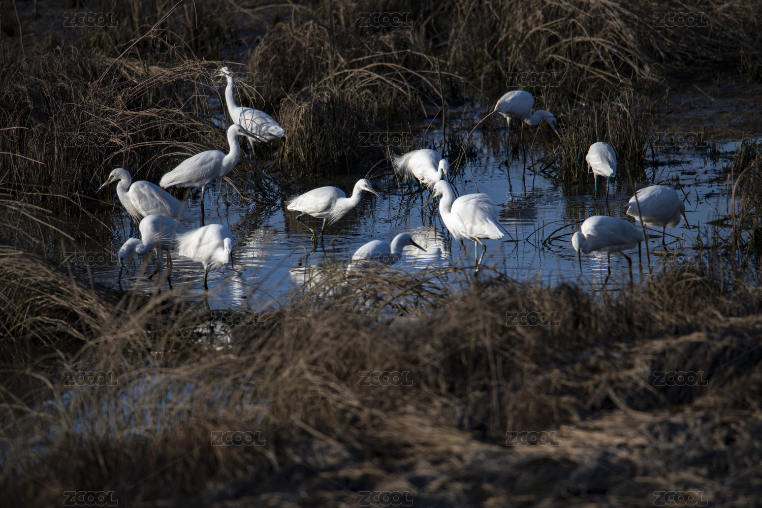 湿地中的白鹭群觅食场景
