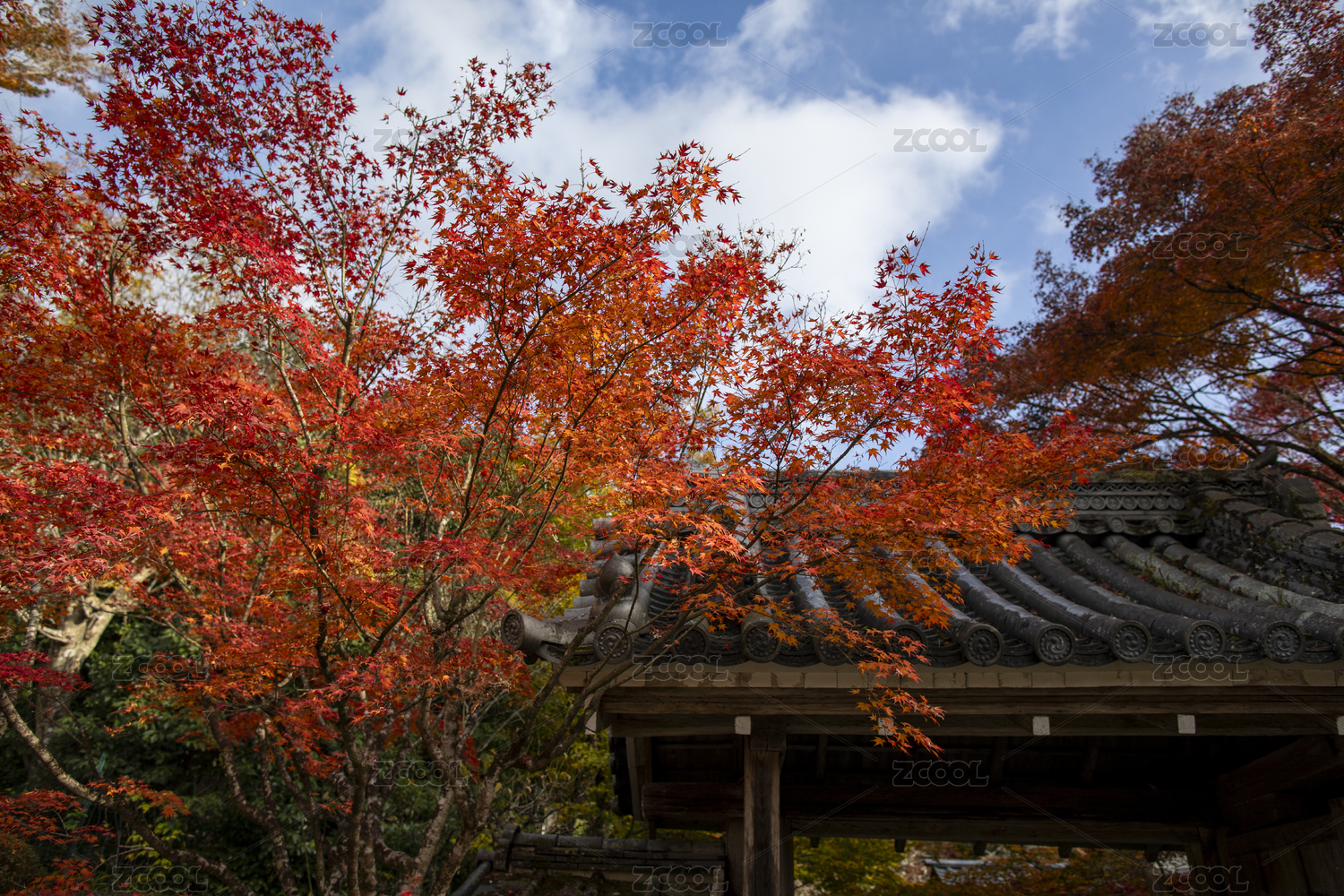 上海秋霞圃屋檐下的红色枫叶