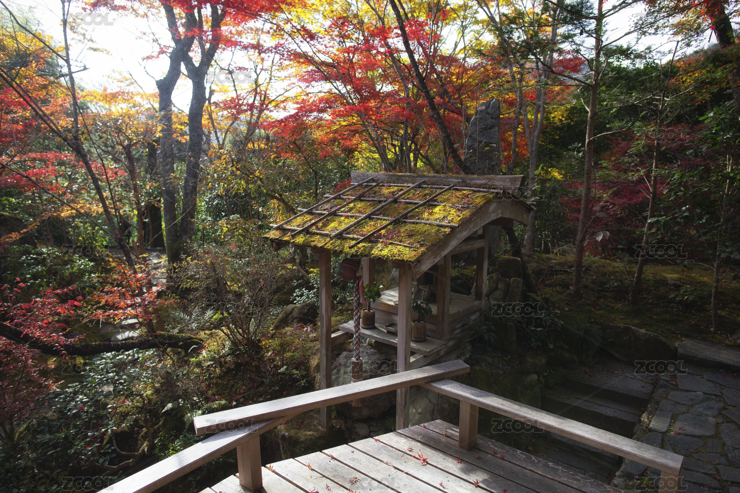 日本京都西芳寺园林景观,花园寺庙与小路,枫叶林里的小路