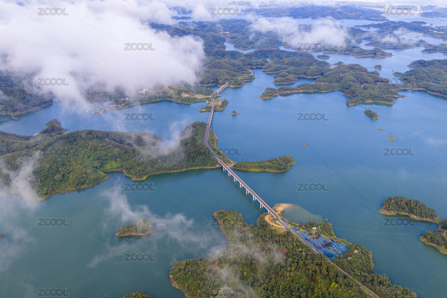 江西靖安观海驿站大型水库中的桥梁和公路俯
