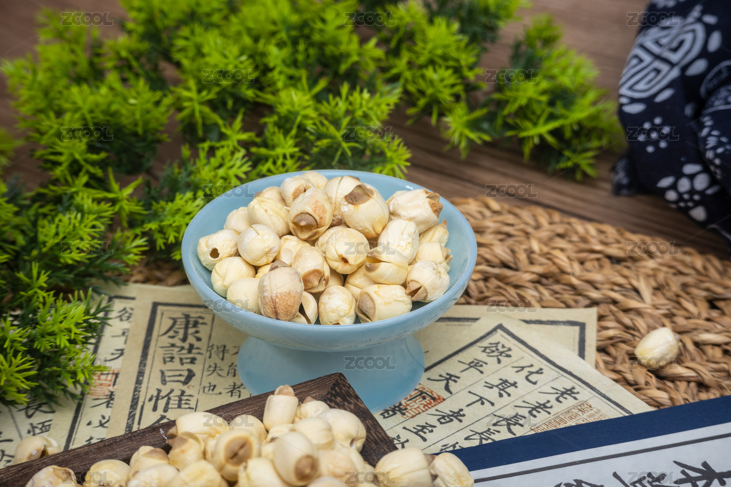 桌面容器装满晒干脱水的中药材芡实药食同源