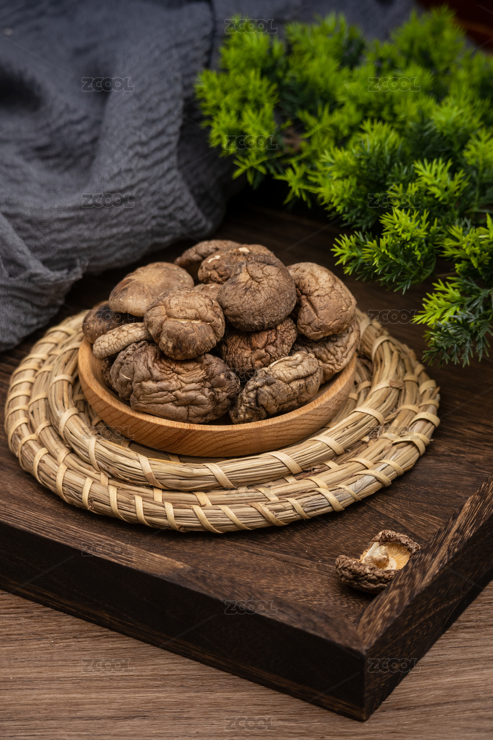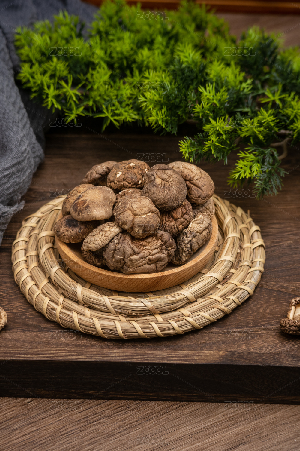 桌面盘子摆放晒干脱水的干香菇菌菇干货