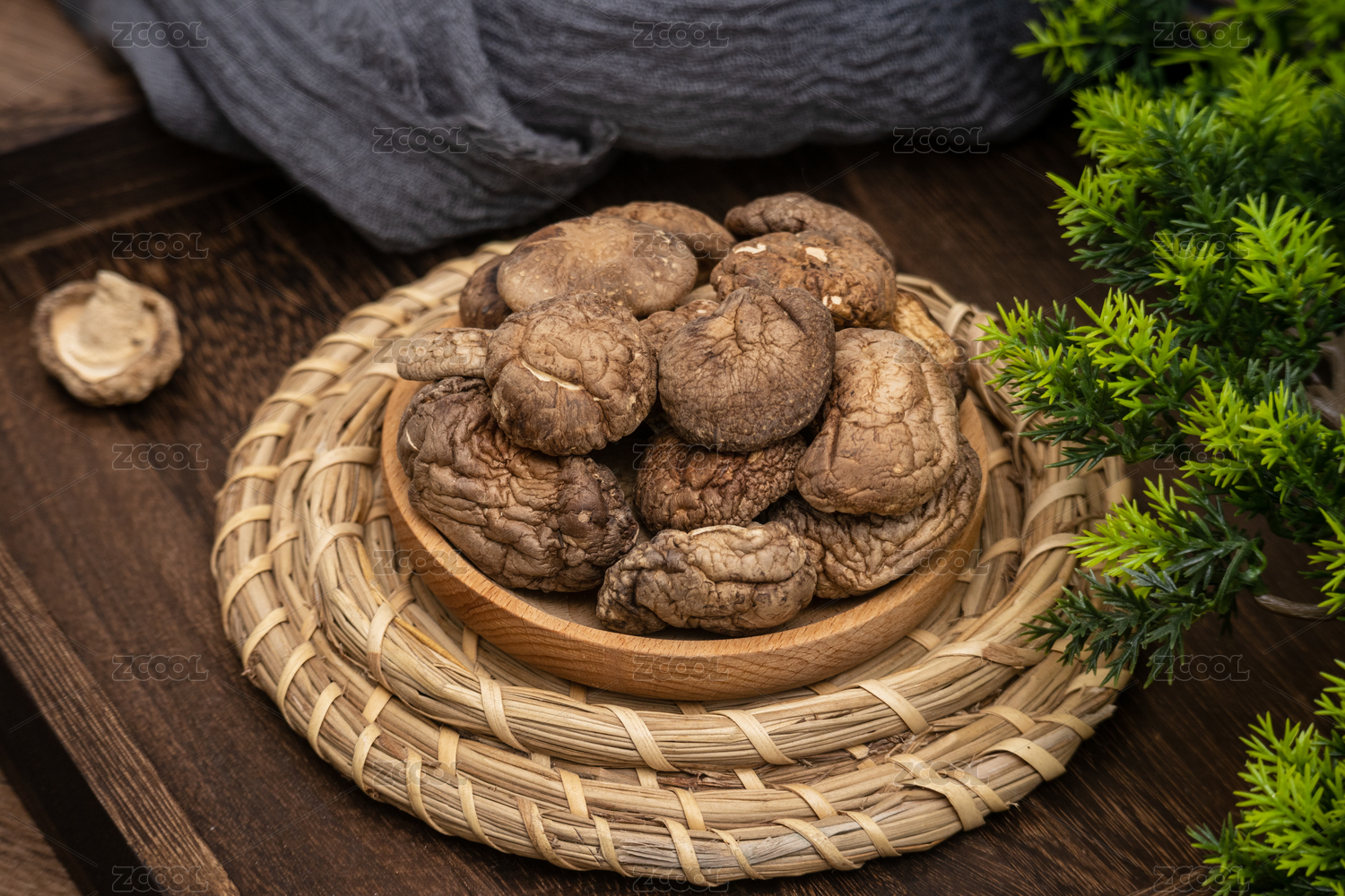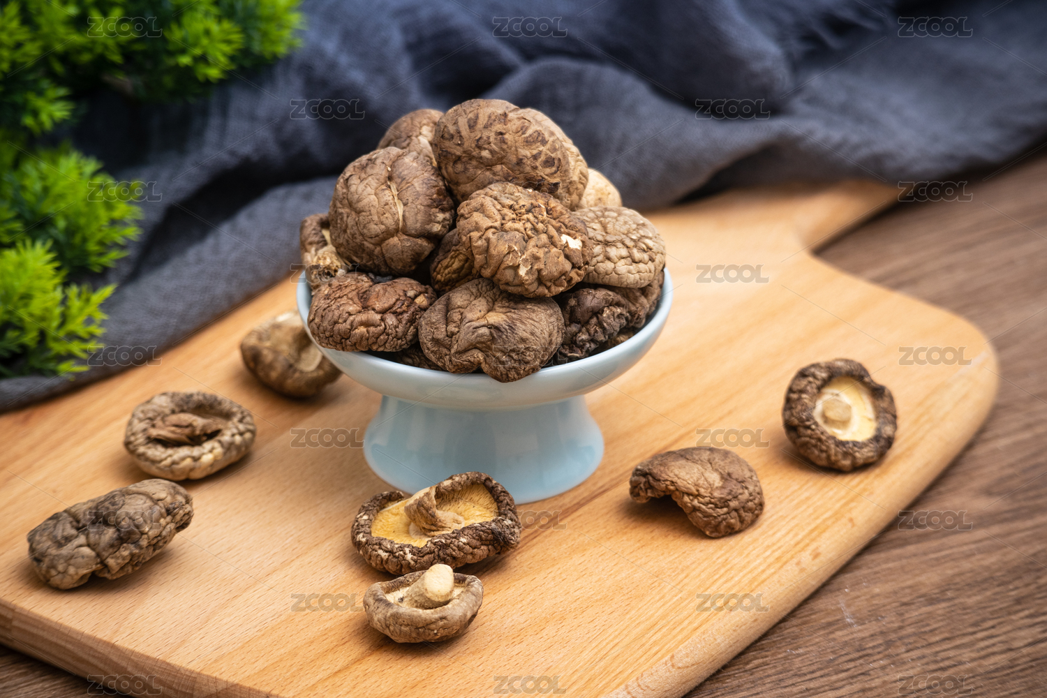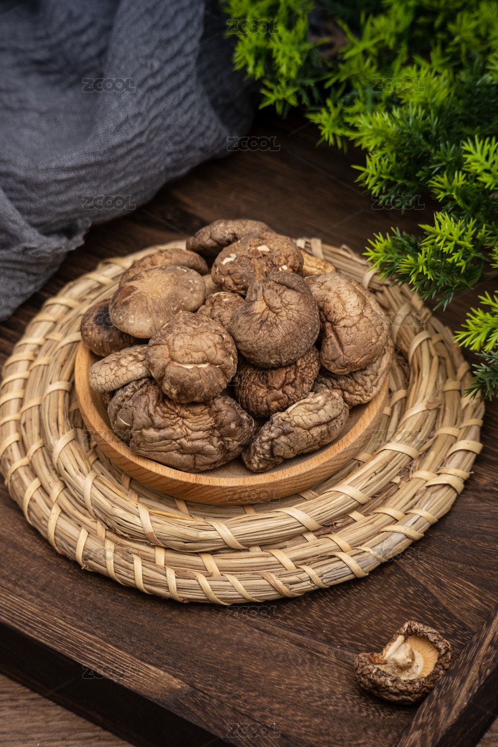 桌面盘子摆放晒干脱水的干香菇菌菇干货