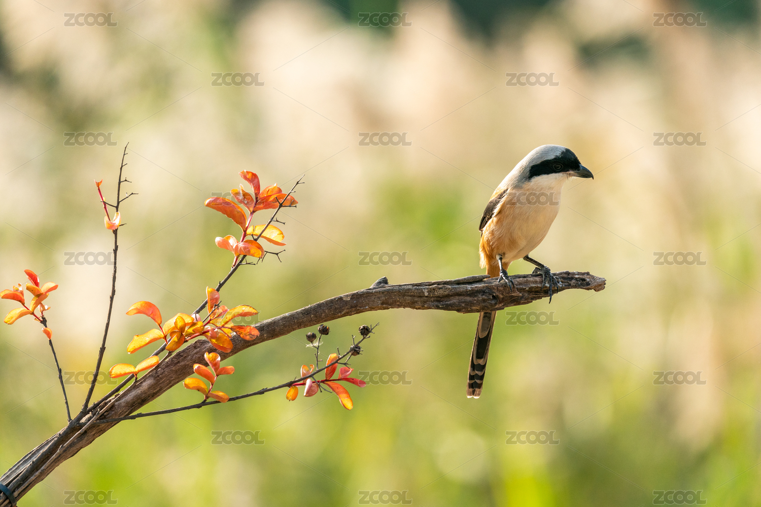 一只棕背伯劳鸟驻守在树枝上搜寻目标食物