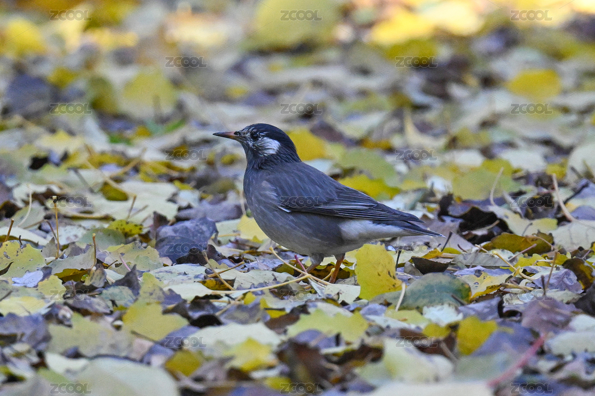 秋天斑鸫在落满果子的地上觅食