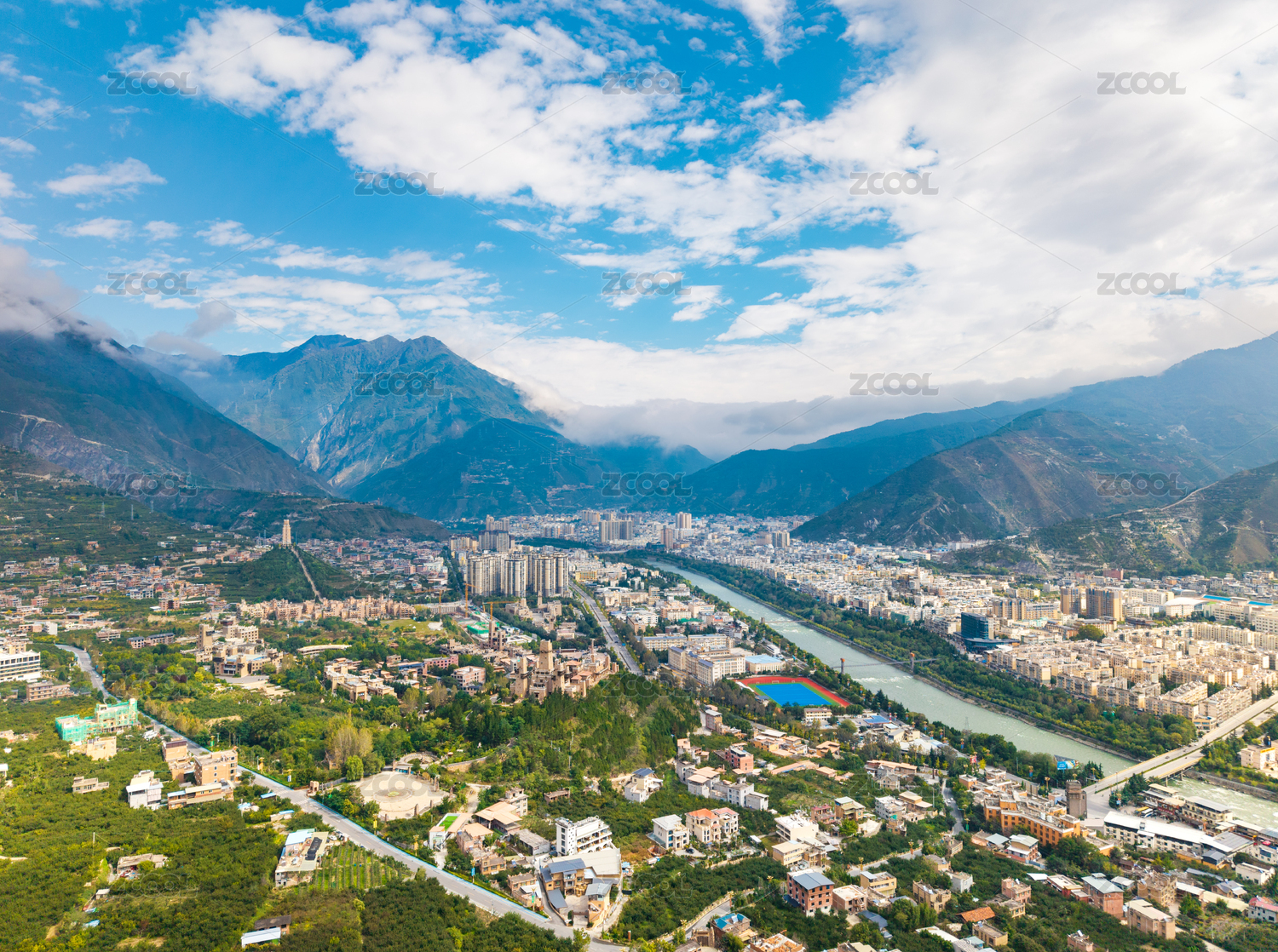 航拍中国四川省阿坝藏族羌族自治州小金县城