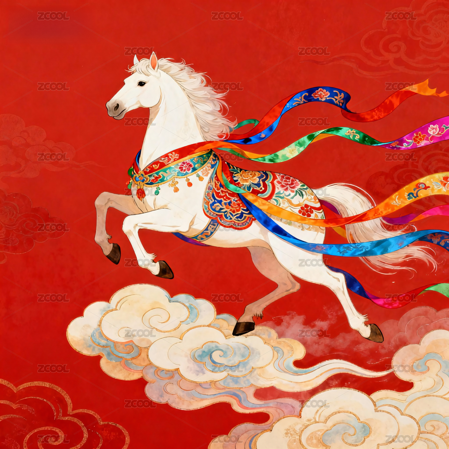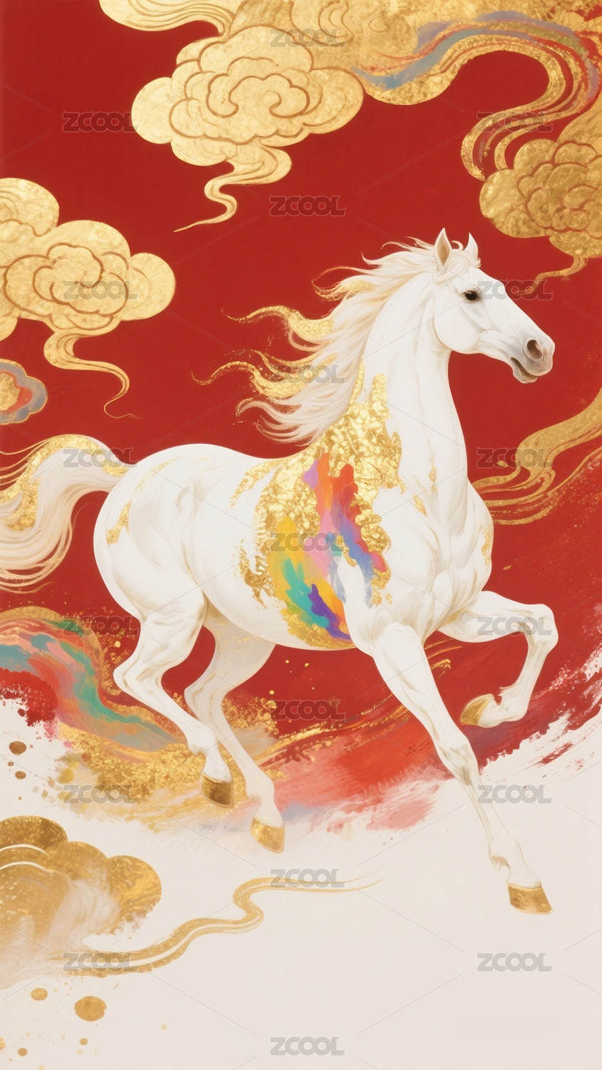 鎏金,瑞马,红底,祥云,白马,彩纹,国潮,祥瑞,华贵,节庆