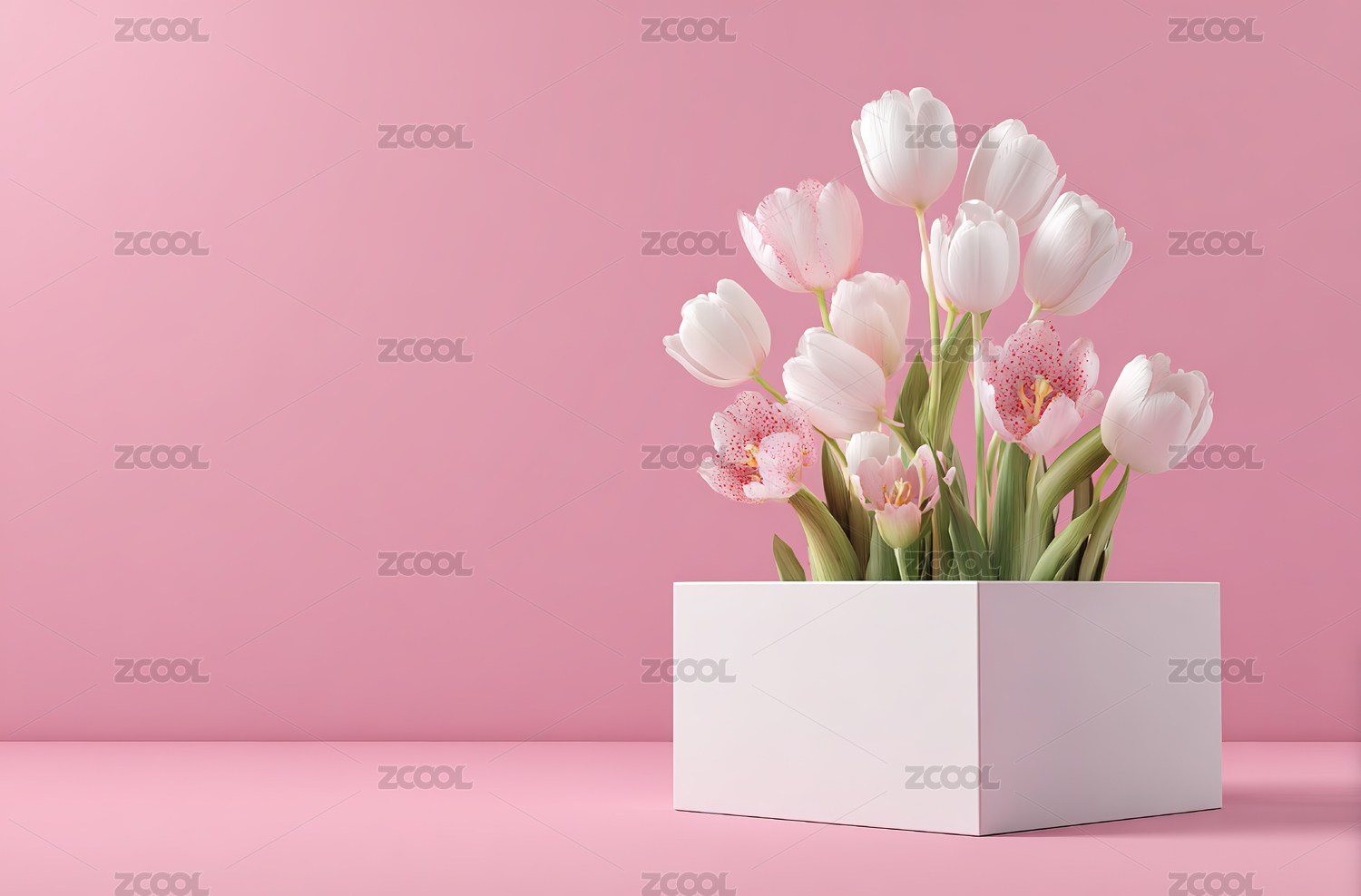 粉色郁金香置于白色方盒中