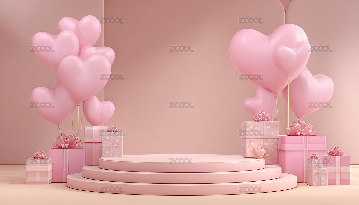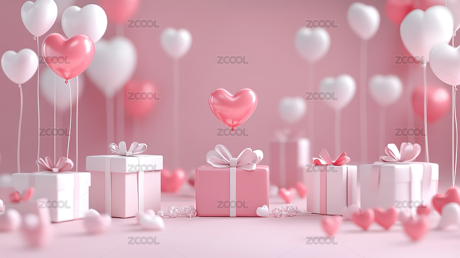 粉色心形气球与礼盒装饰场景
