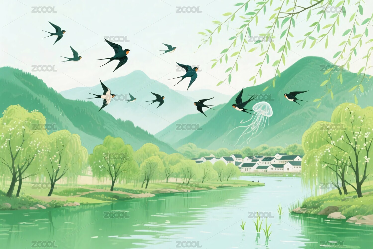 春雨,燕子,柳树,稻田,乡村,田园风光,春天,绿色,下雨,田野