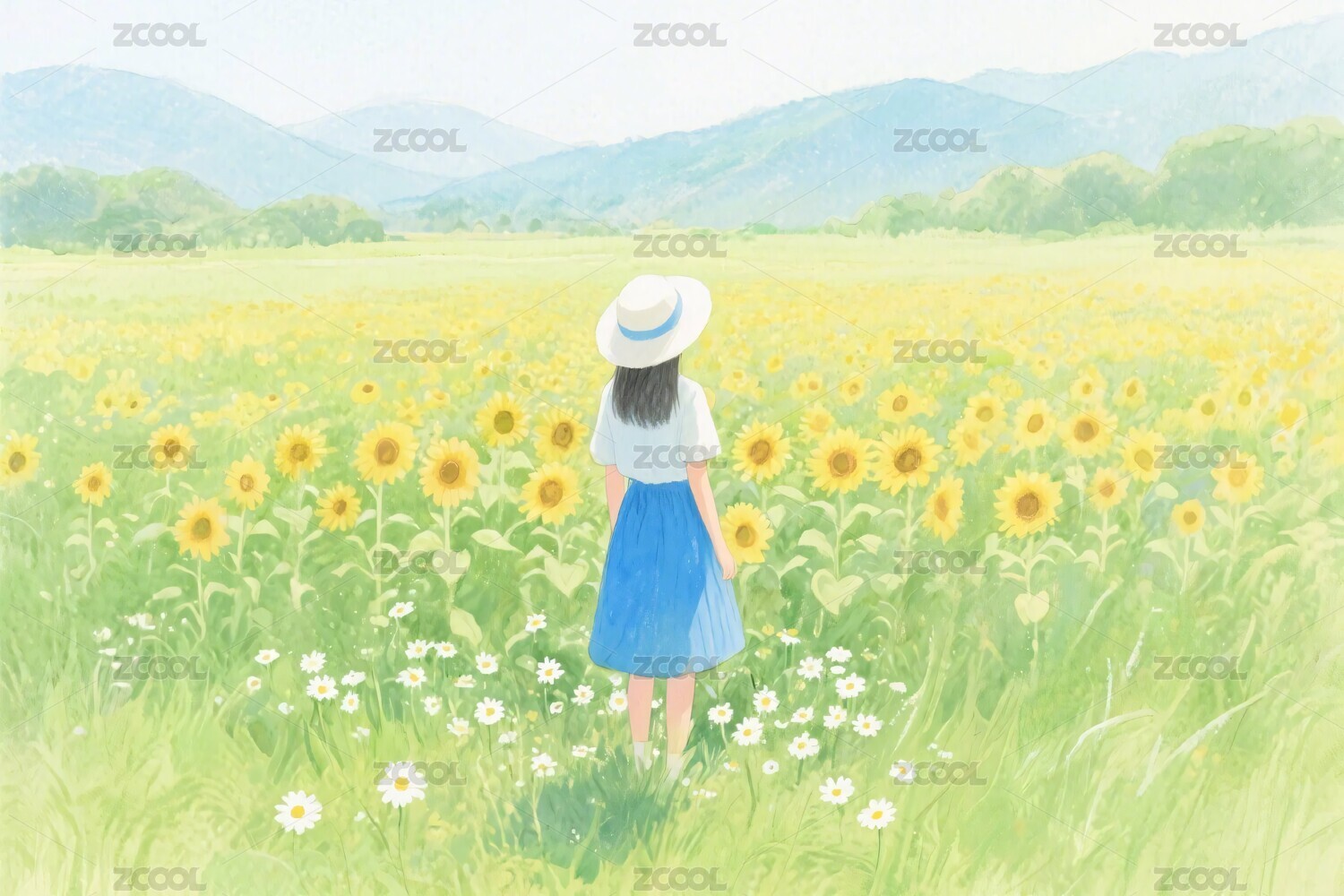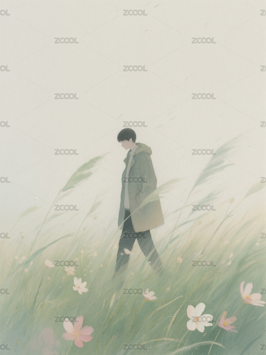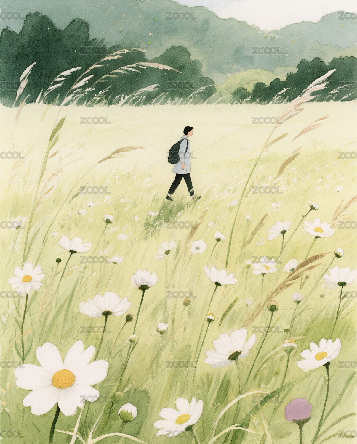 草地,徒步者,小雏菊,背包,行走,绿色,自然,户外,背影,插画