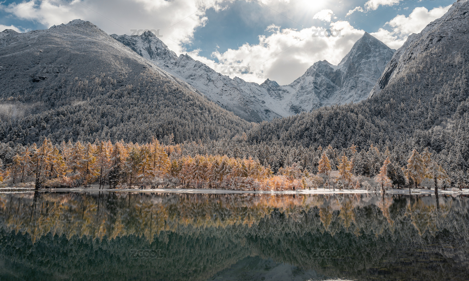 四姑娘山双桥沟秋季雪山彩林碧水景观