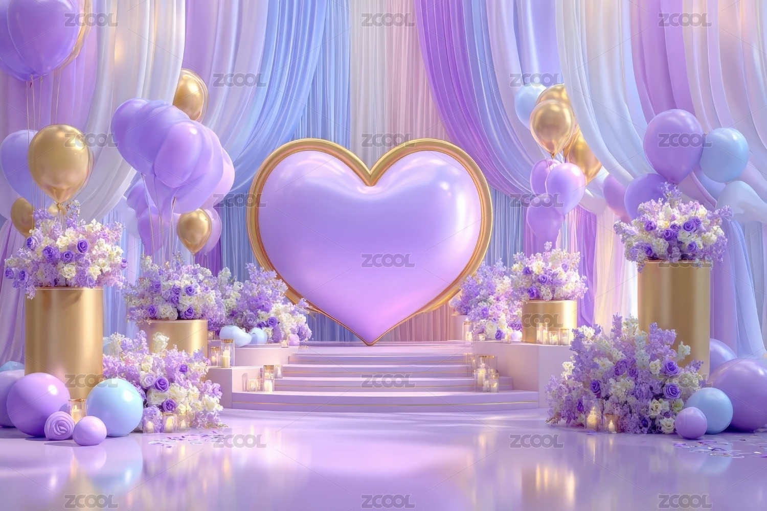 紫色心形气球装饰的台阶场景