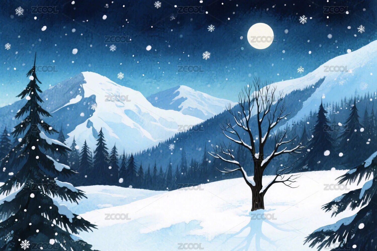 雪景,冬季,雪地,山脉,树木,松树,月亮,星空,夜空,插画