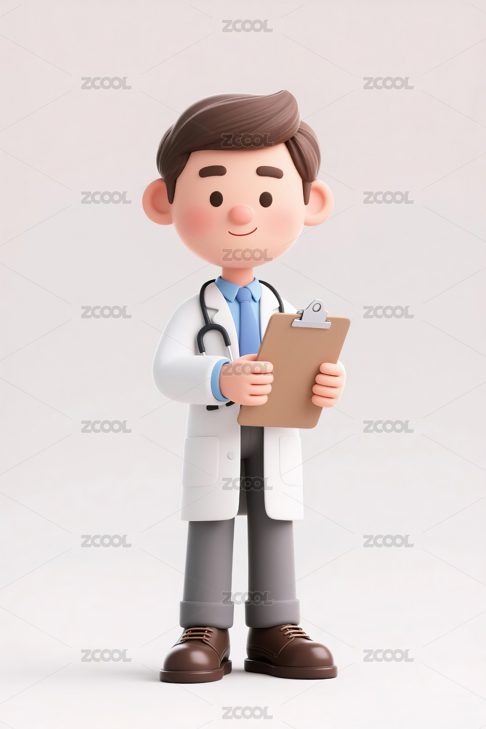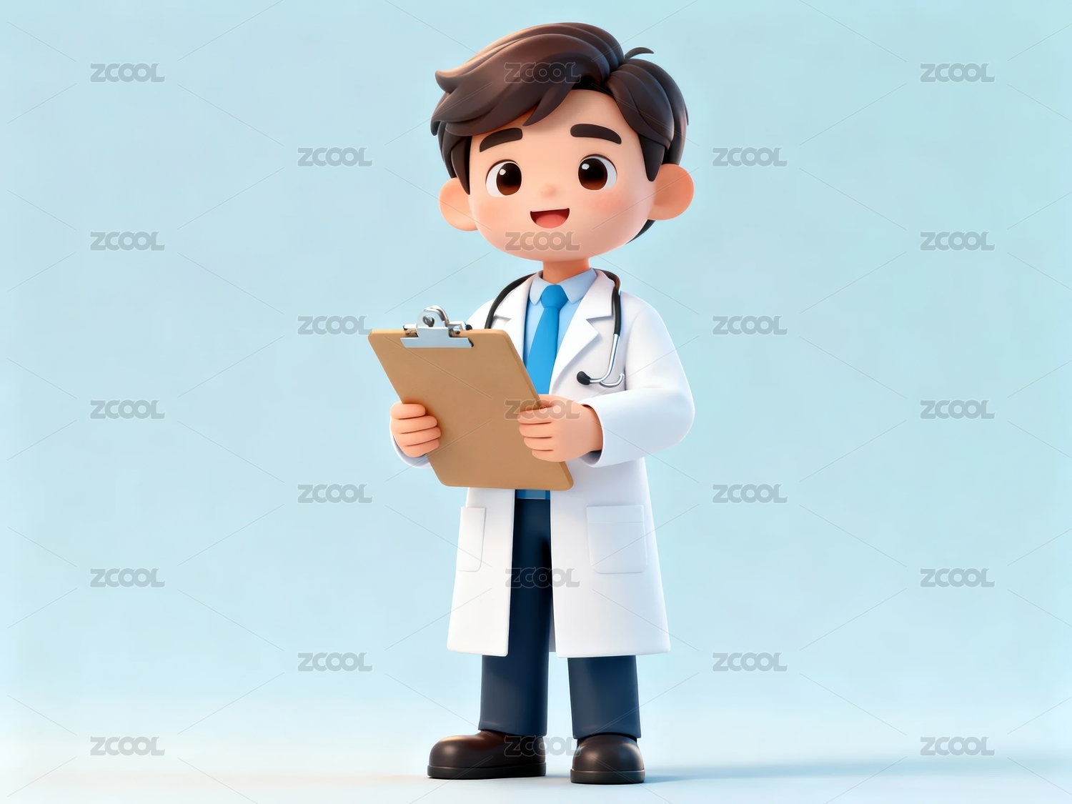 卡通,医生,白大褂,听诊器,平板,眼镜,黑发,蓝服,对话泡,透明