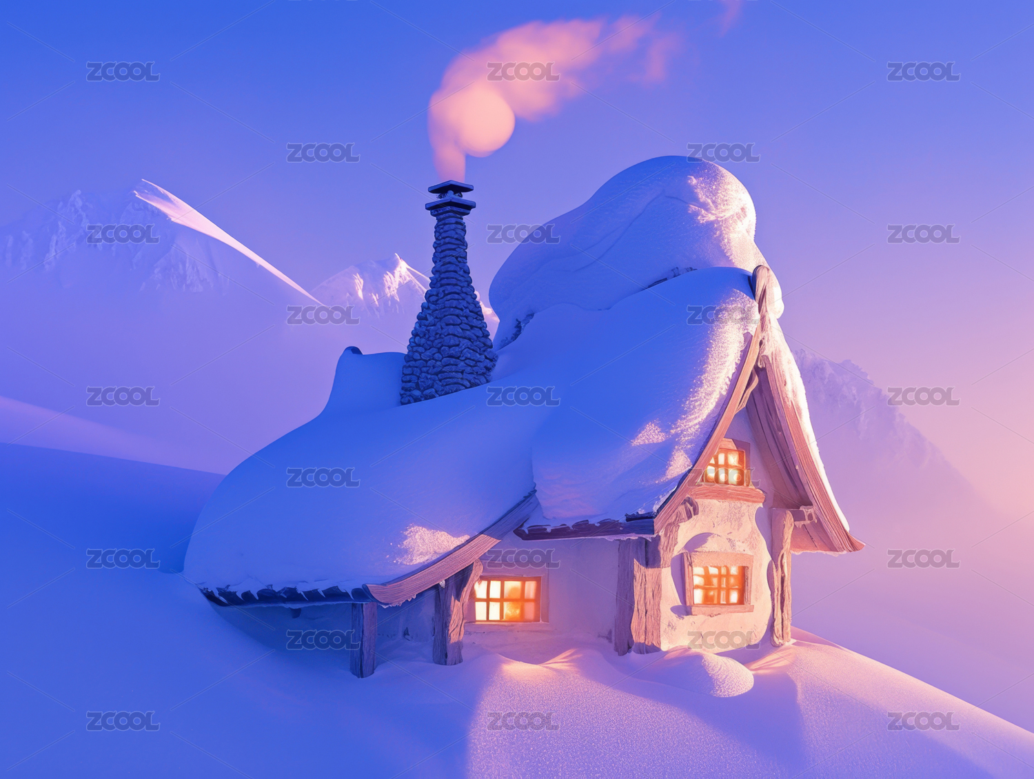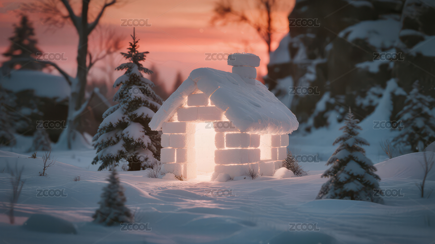 梦幻冬日夕阳映照雪块砌成小屋发出柔和灯光