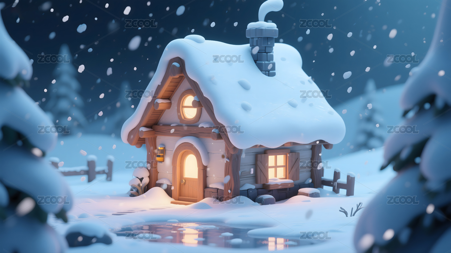 雪夜小屋温馨梦幻