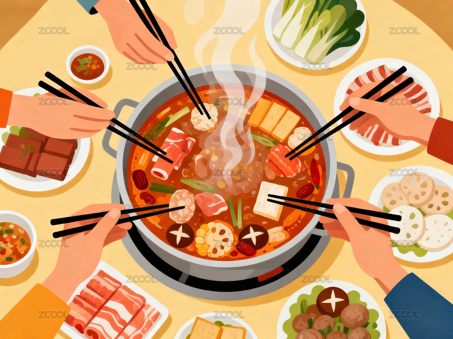 火锅,食材,插画,肥牛卷,筷子,热气,蔬菜,蘸料,肉类,餐桌