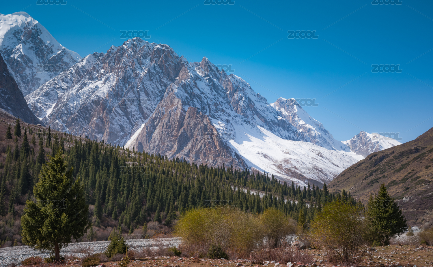 中国新疆天山山脉冬季的雪山和云杉林