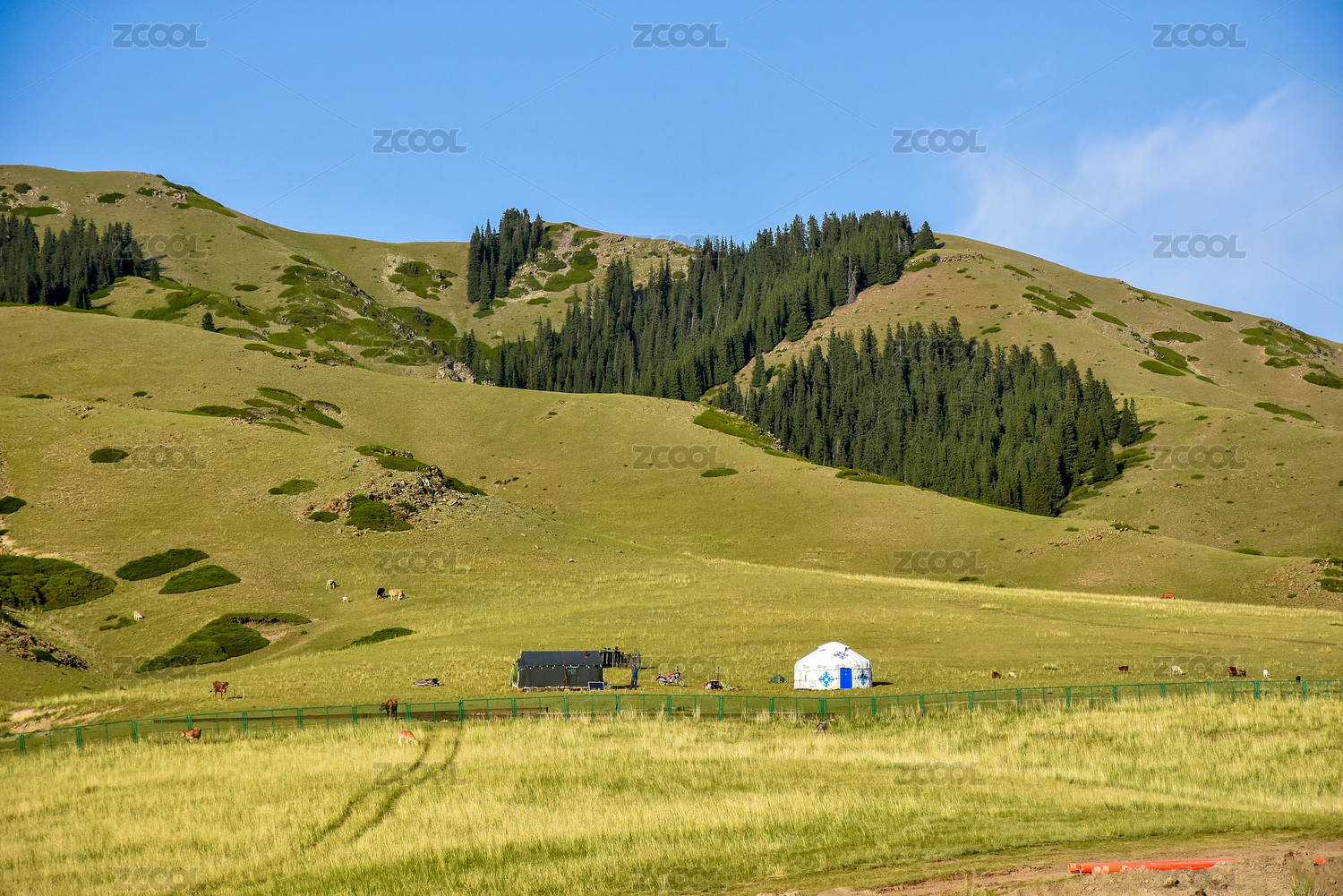 蓝天白云下中国新疆伊犁草原森林美丽风光