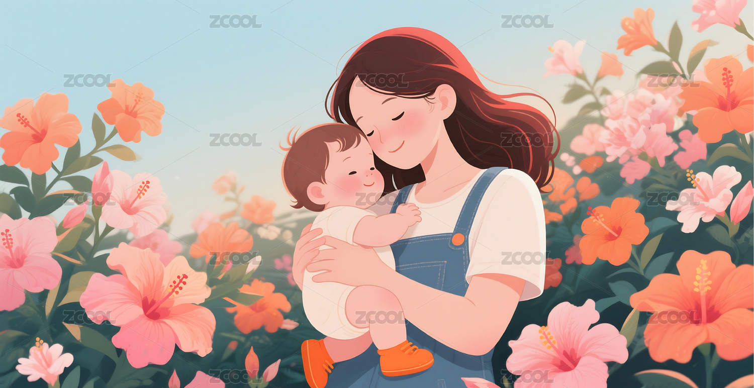 母子,拥抱,温馨,亲子,春天,插画,母爱,儿童,花朵,绿叶