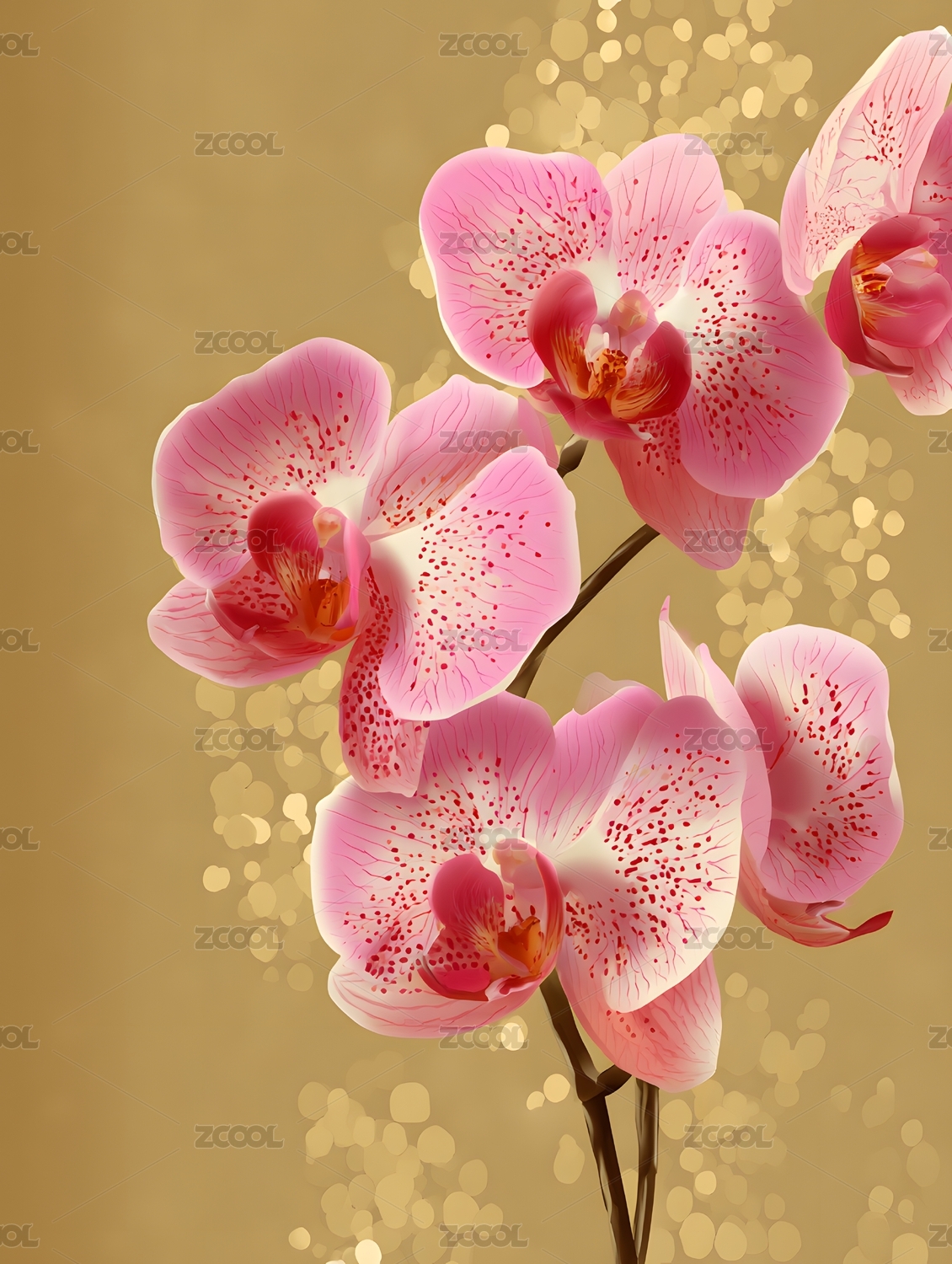 粉色兰花在金色背景上绽放