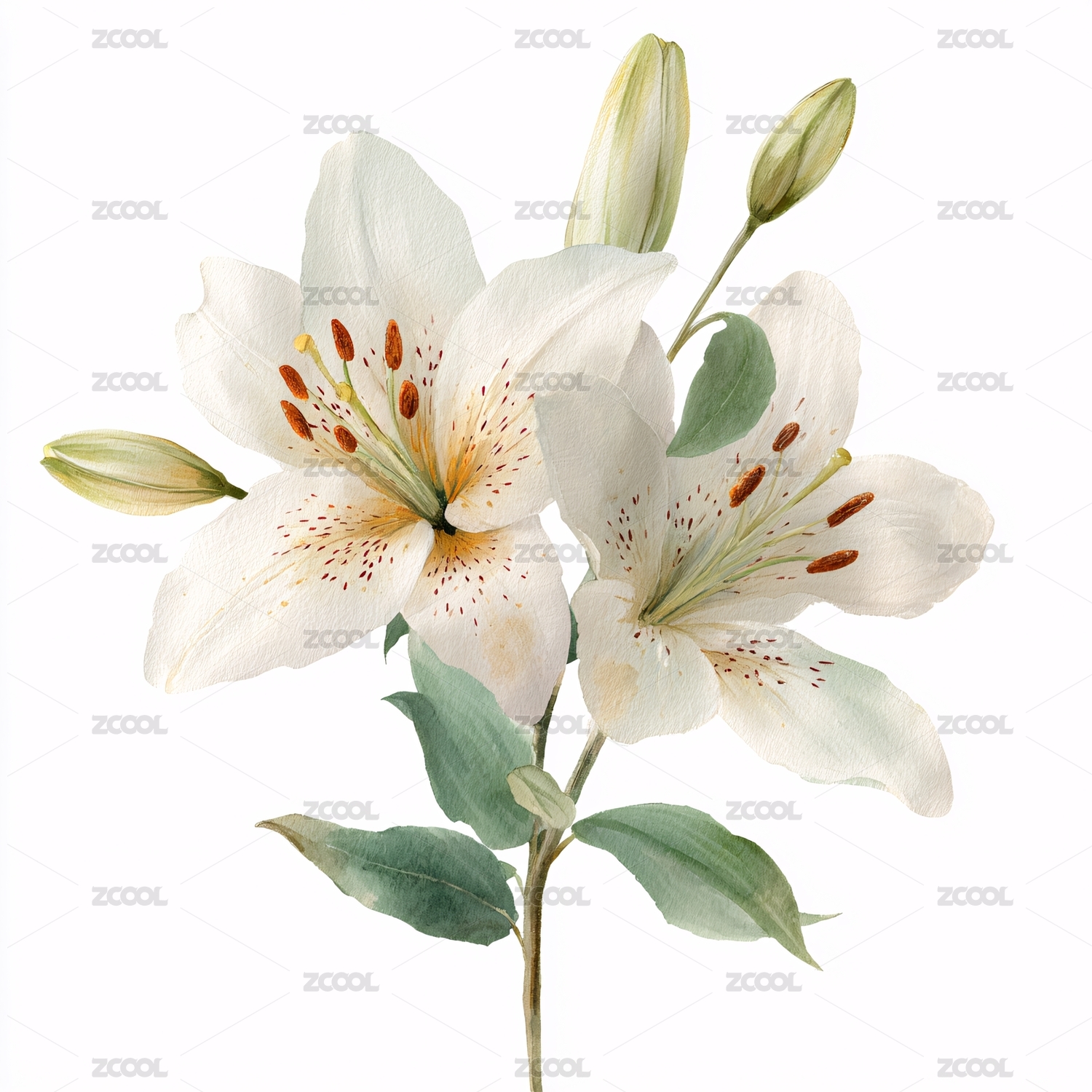 水彩风三朵盛开的黄色百合花与蓝色花苞