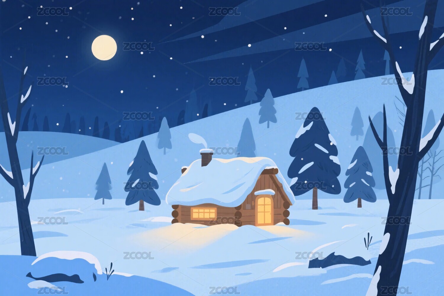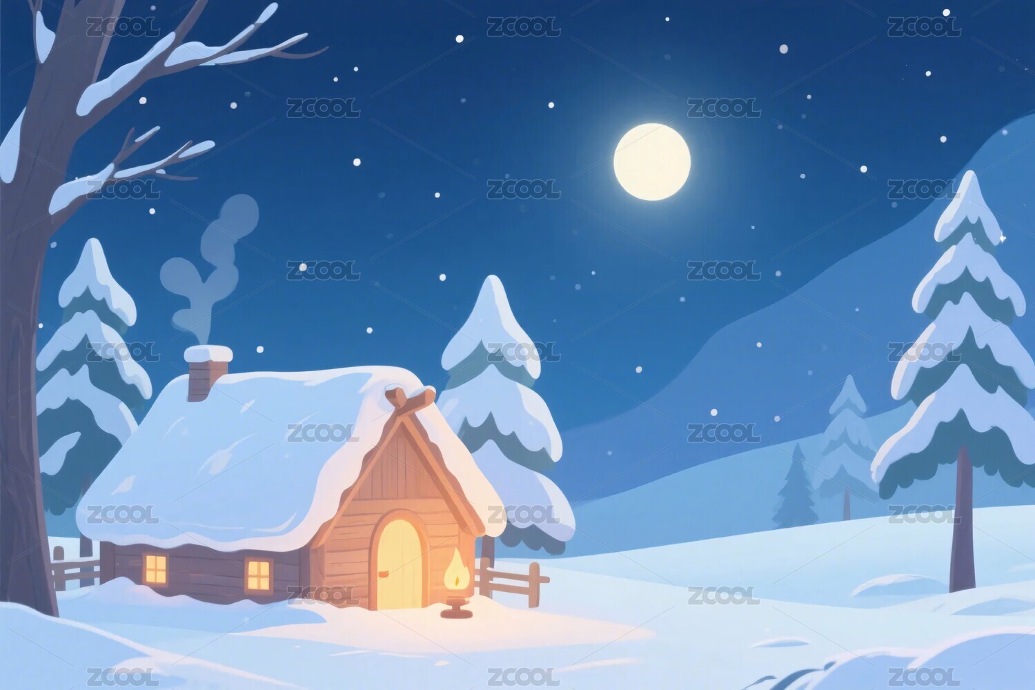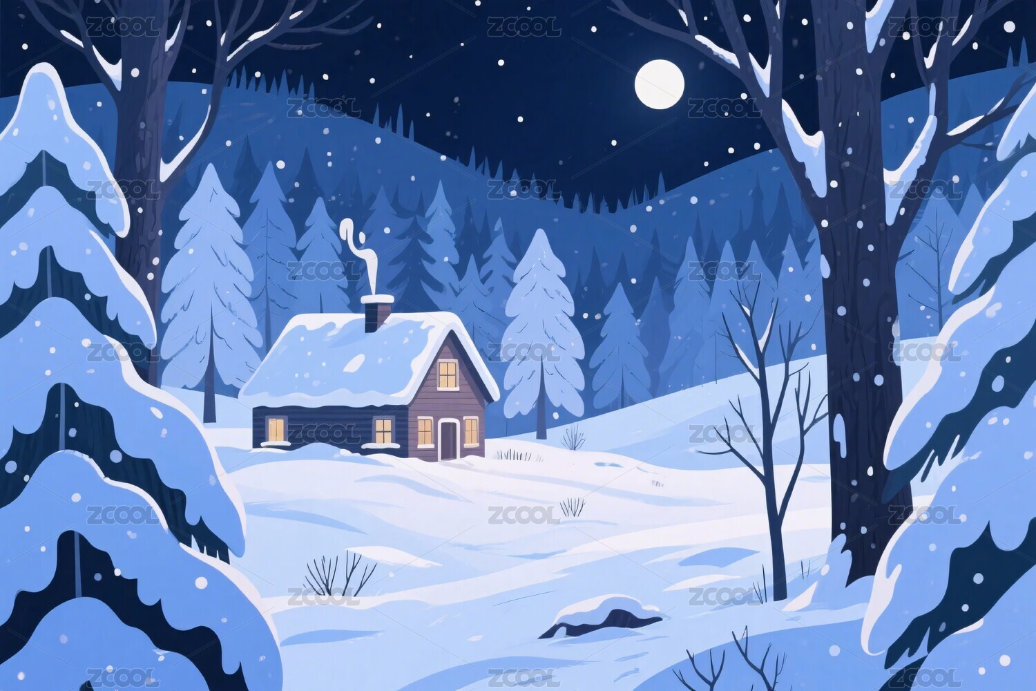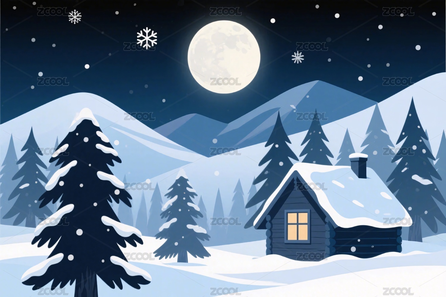 圣诞节,雪景,夜晚,雪山,小屋,圣诞树,星星,月亮,灯光,森林