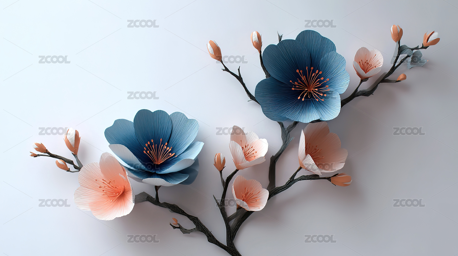 粉色桃花枝条绽放 浅蓝背景浪漫