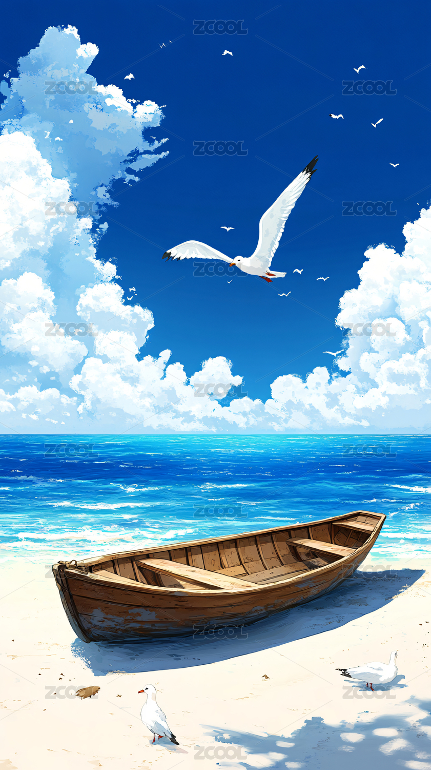 夏季晴朗沙滩有长青苔岩石的海边绘画插画