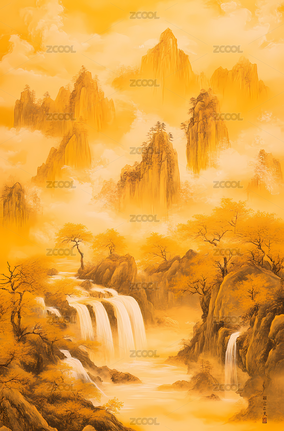 金色,自然,色彩,艺术,绘画,水墨,风景,树木,山谷,传统