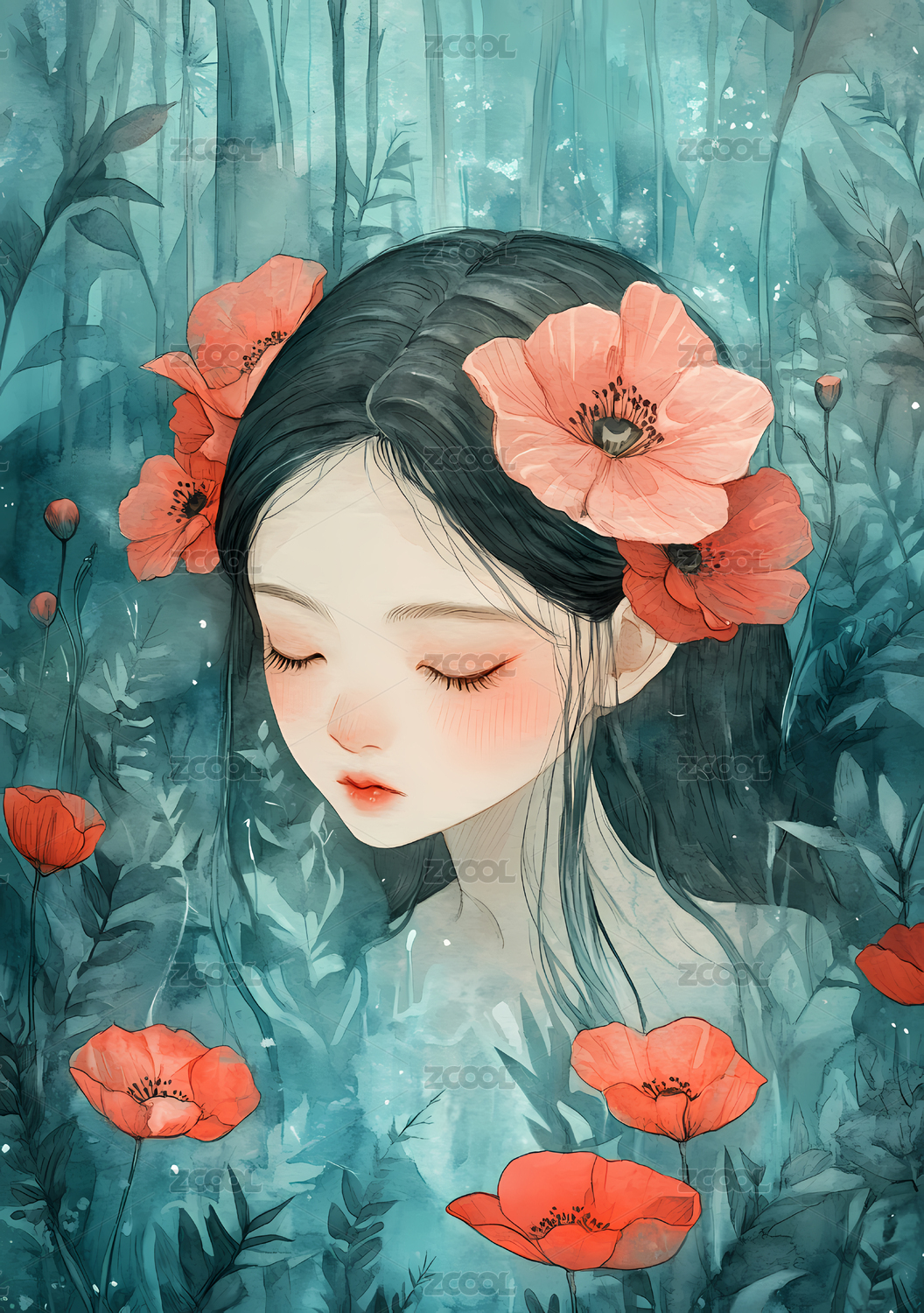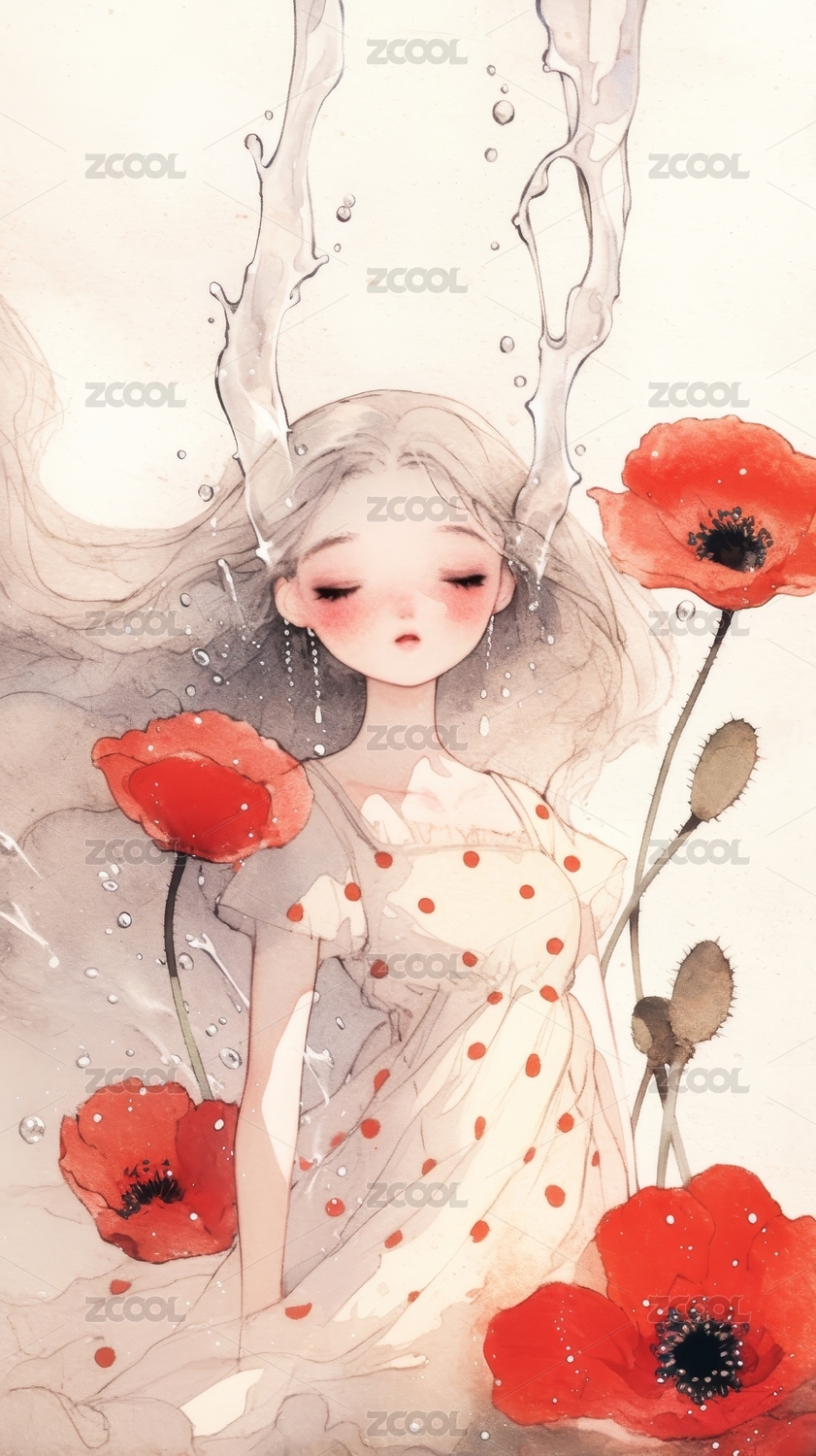 水彩画中少女与罂粟花
