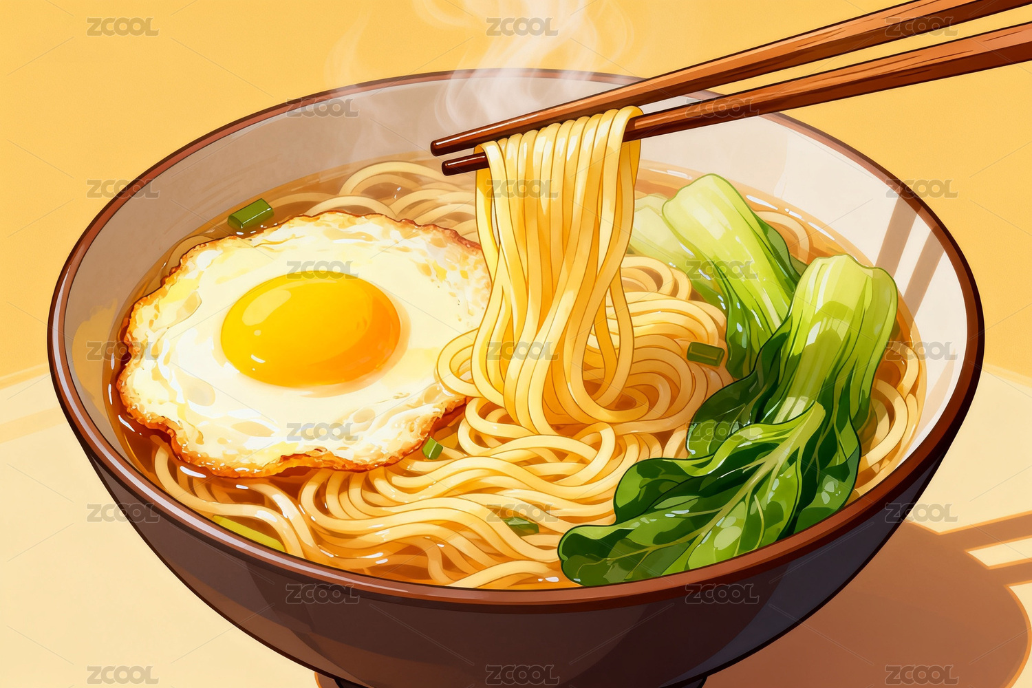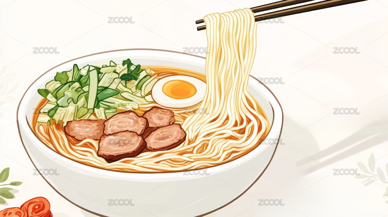 拉面,插画,日式,鸡蛋,叉烧,葱花,筷子,面条,美食,卡通