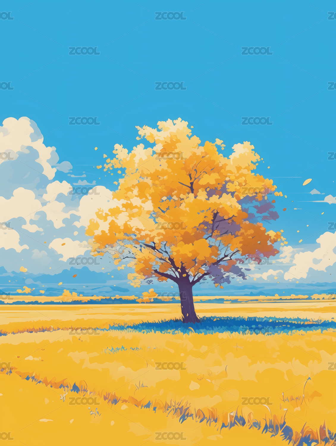 一个树在绿色山丘立秋秋分节气3D卡通插画