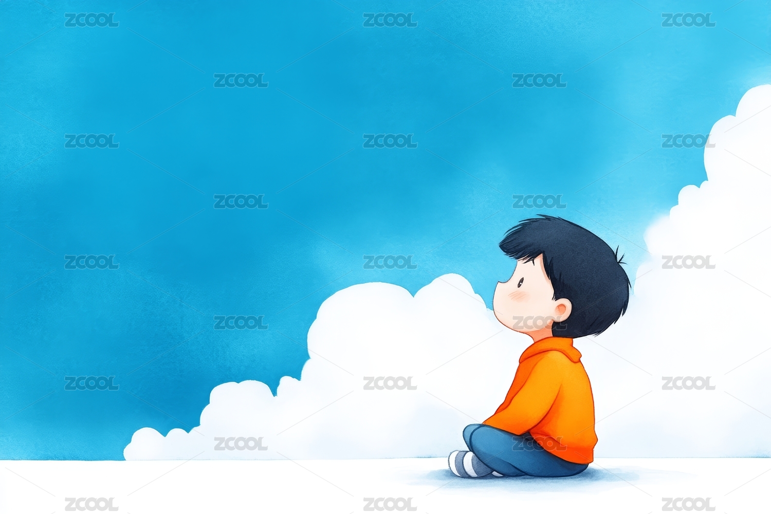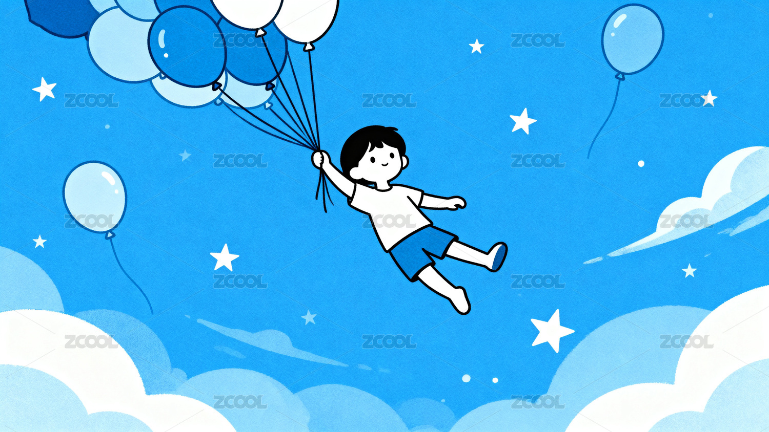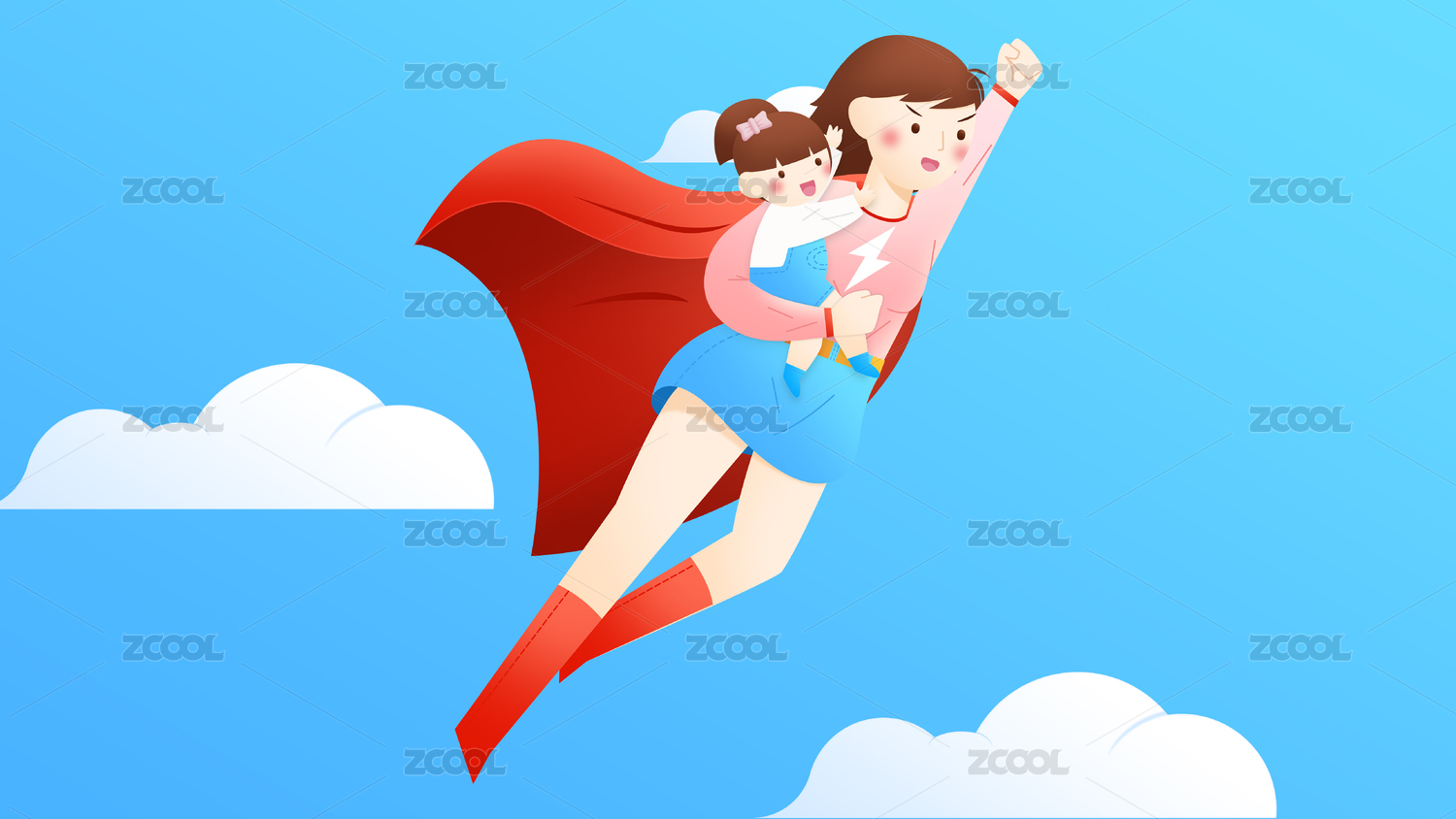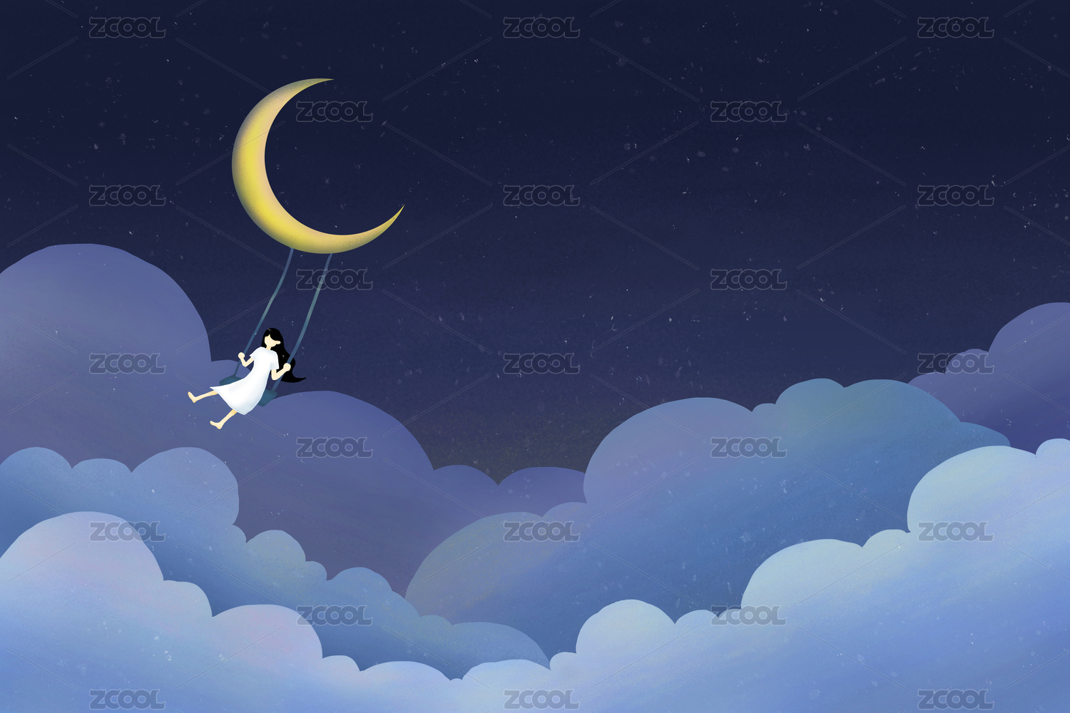 儿童节插画,空中踏着云朵的小女孩和泰迪熊
