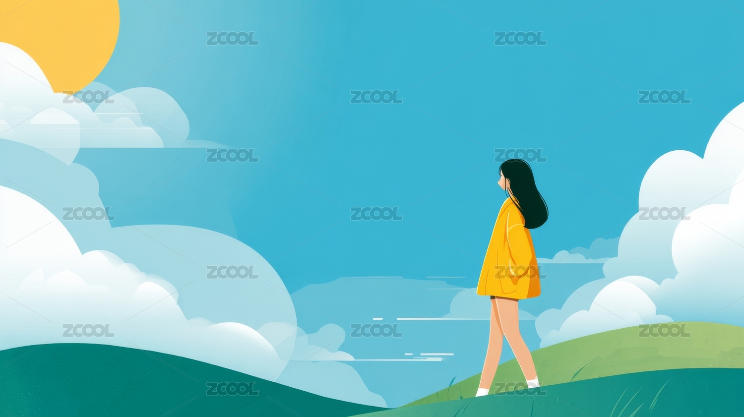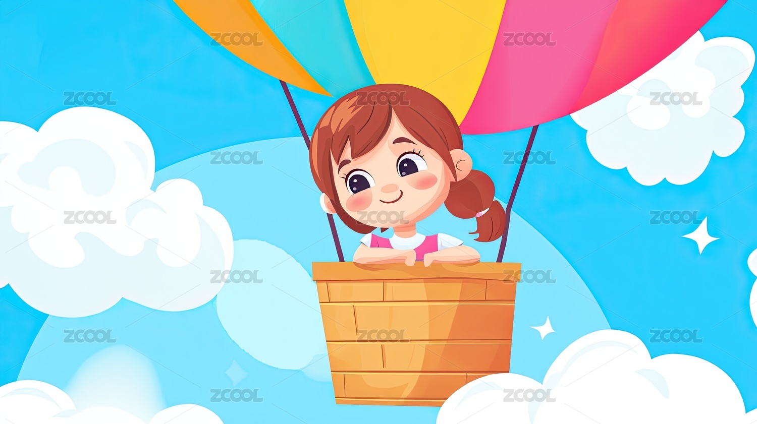 儿童节插画,天空中的太阳、小女孩和泰熊