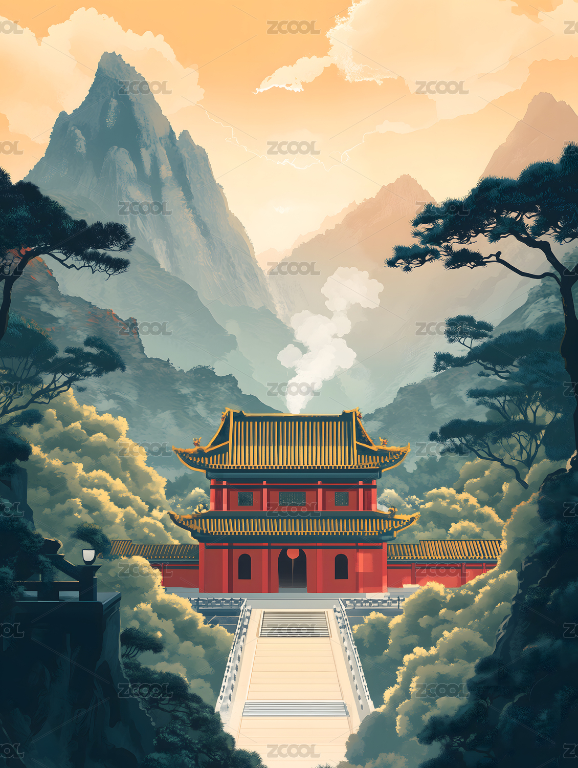 国潮风室外场景宫殿寺庙屋檐台阶背景插画