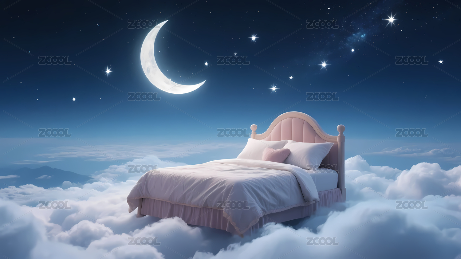 3D渲染,夜空云端上紫色的床