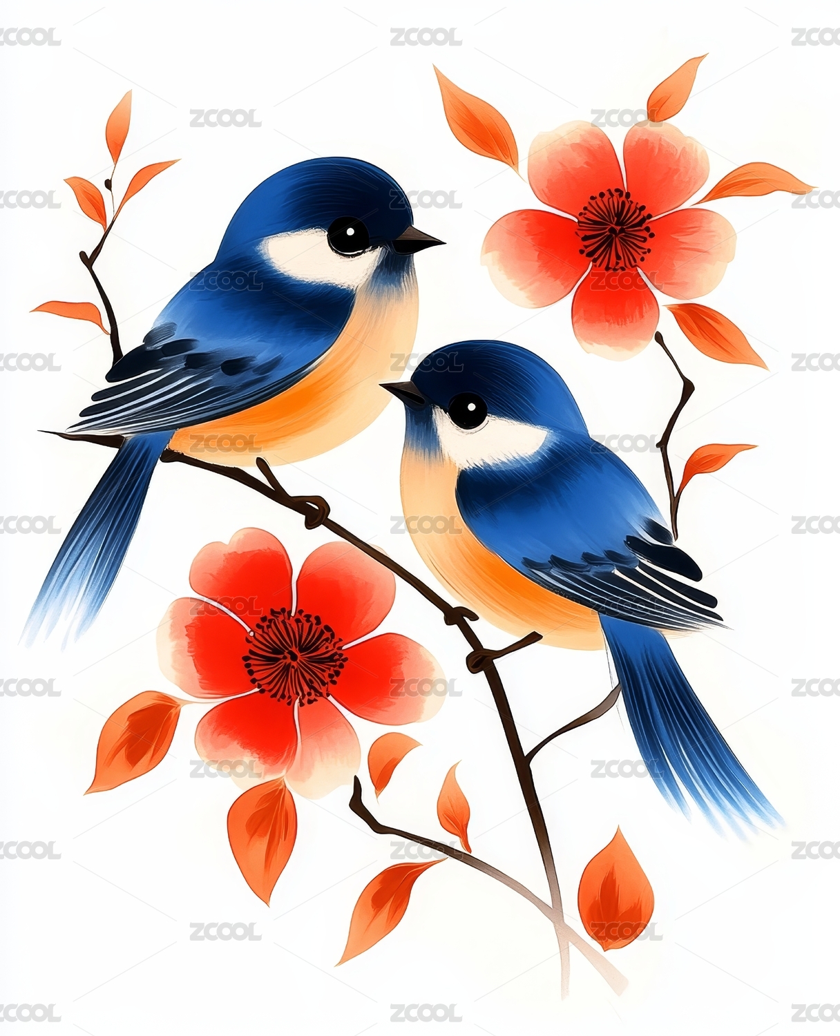一只鸟站在树枝植物花卉上国画工笔画艺术