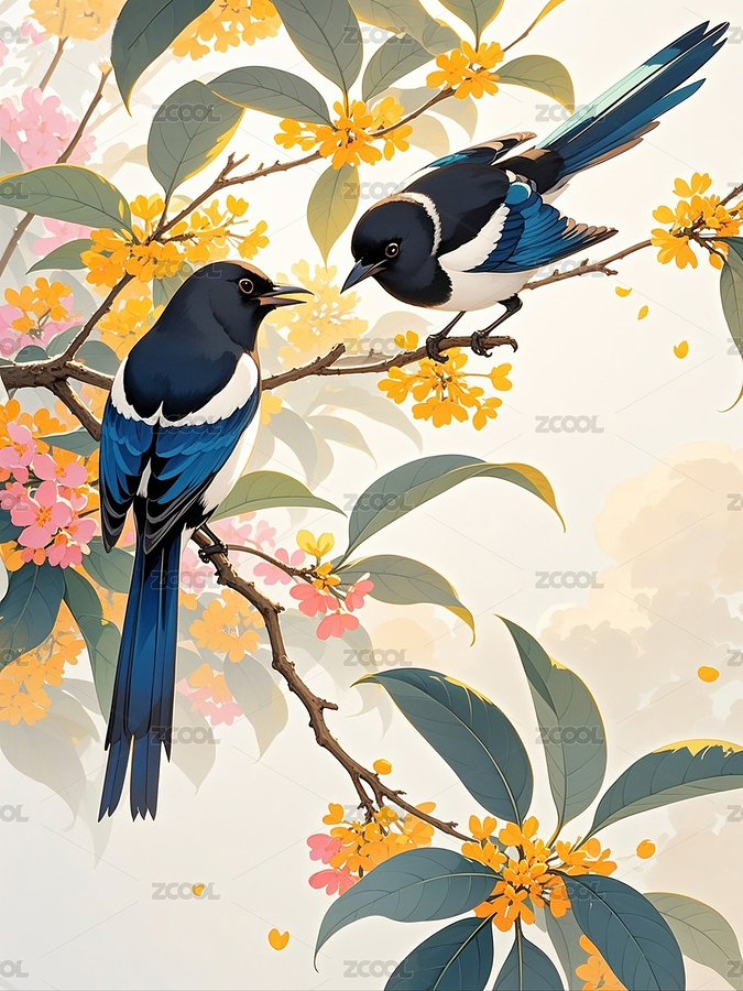 桂花,喜鹊,花鸟,植物,花卉,传统,插画