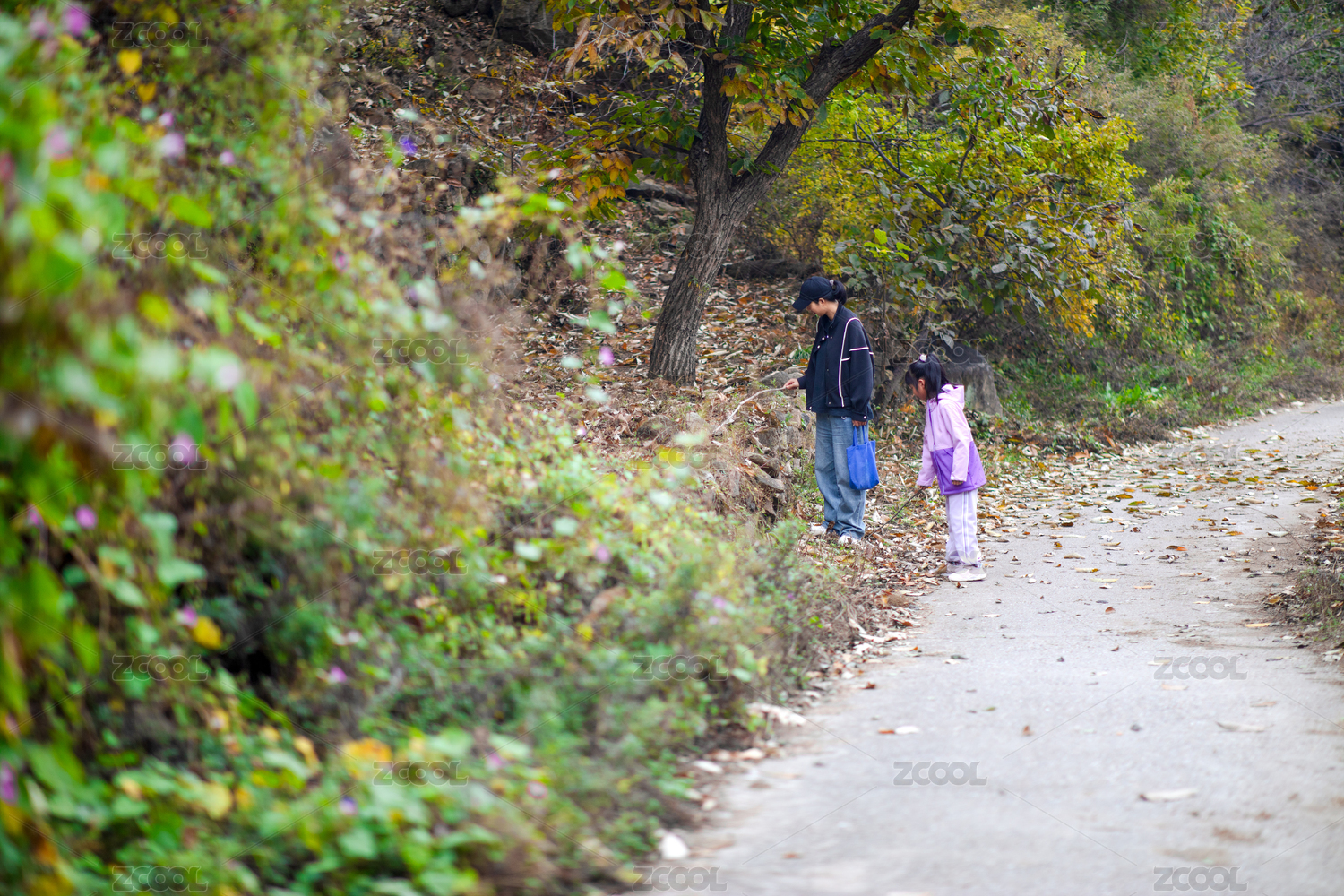 户外的年轻妈妈和女儿在秋天