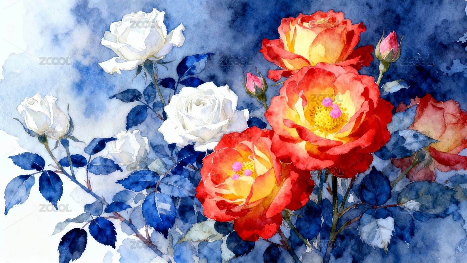 蓝白色调玫瑰水彩风格壁纸场景