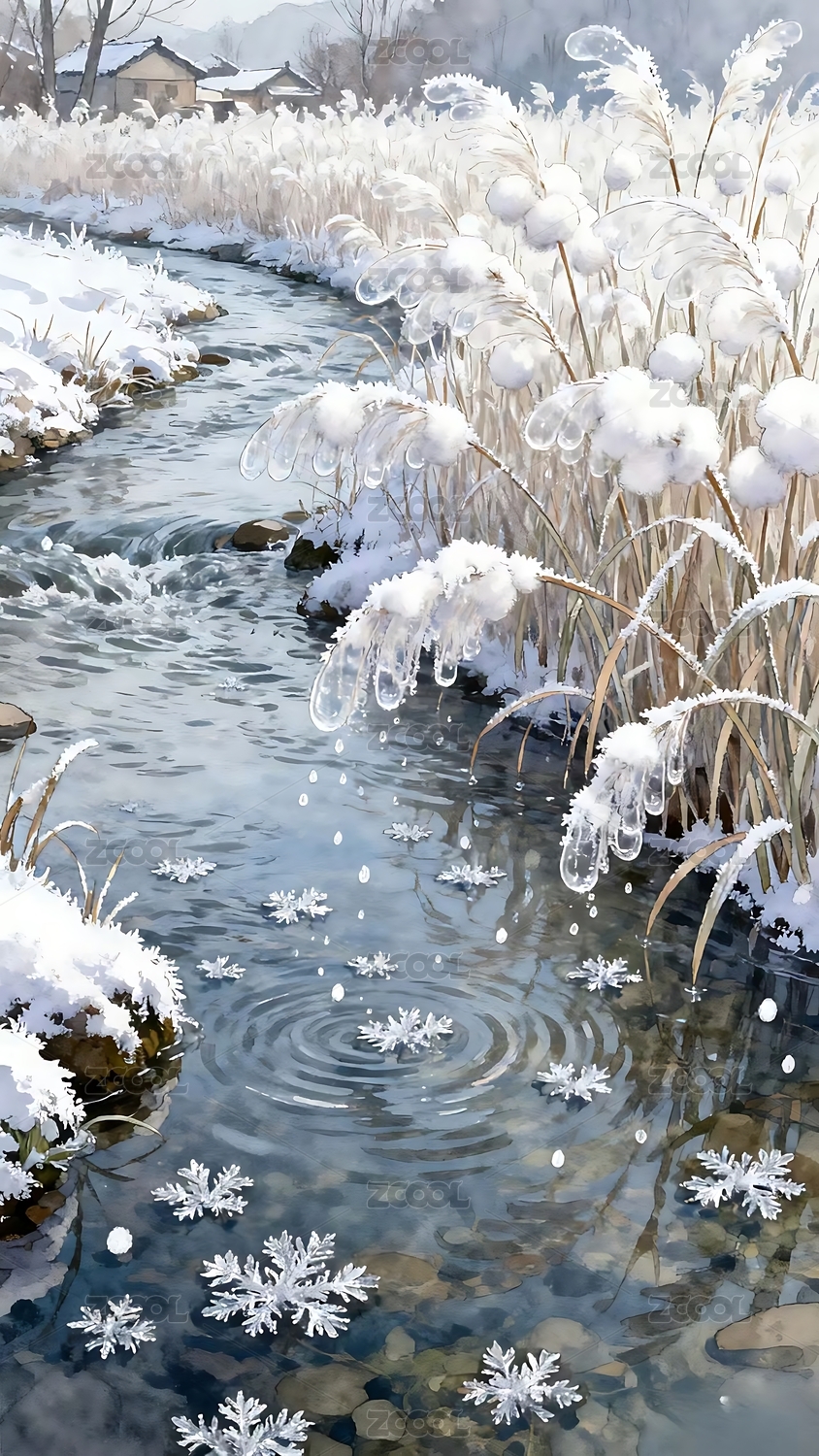 寒溪,积雪,霜枝,冰棱,苇丛,白絮,凝霜,涧水,雾凇,冷流