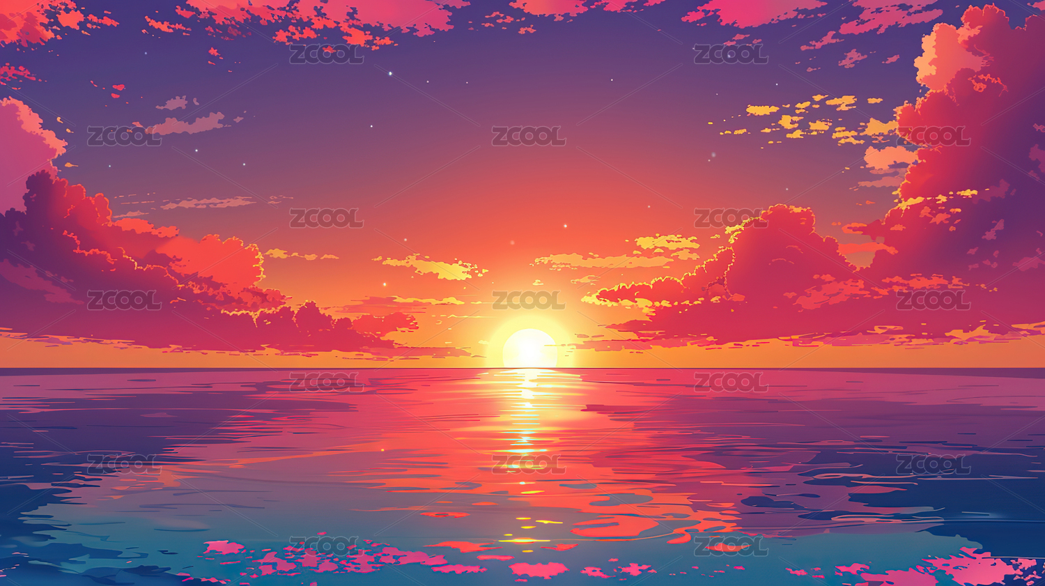 梦幻般的日落景色天空水面星光点缀