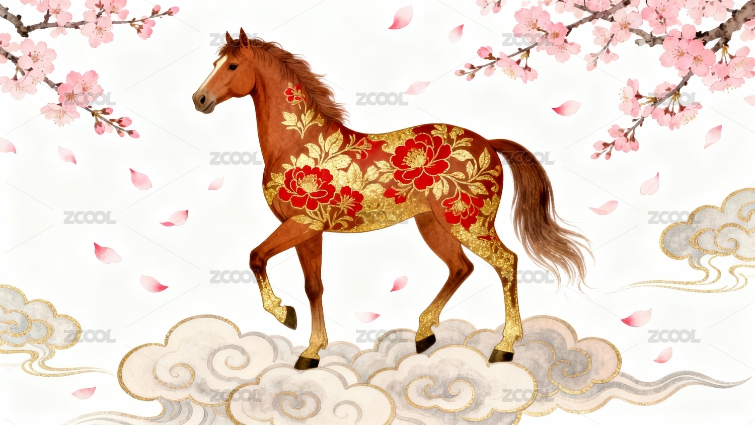 红色背景下的金色马与梅花