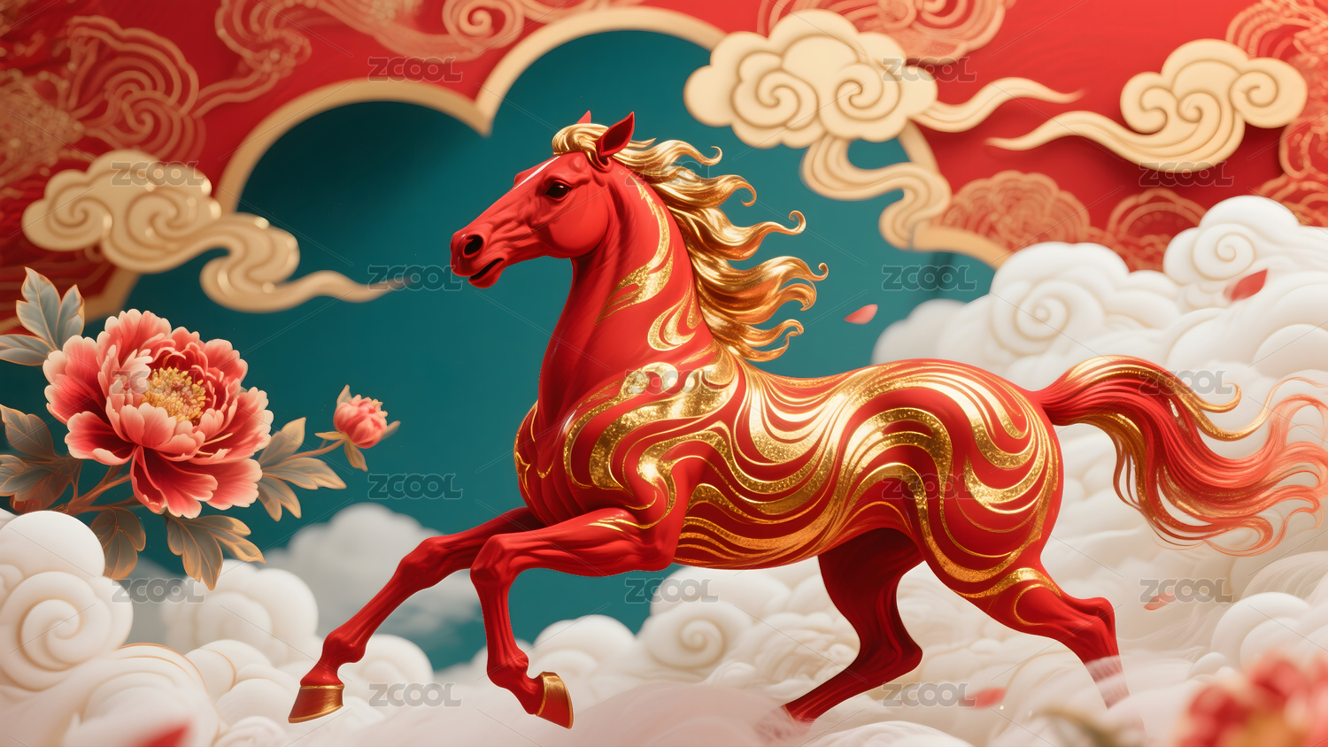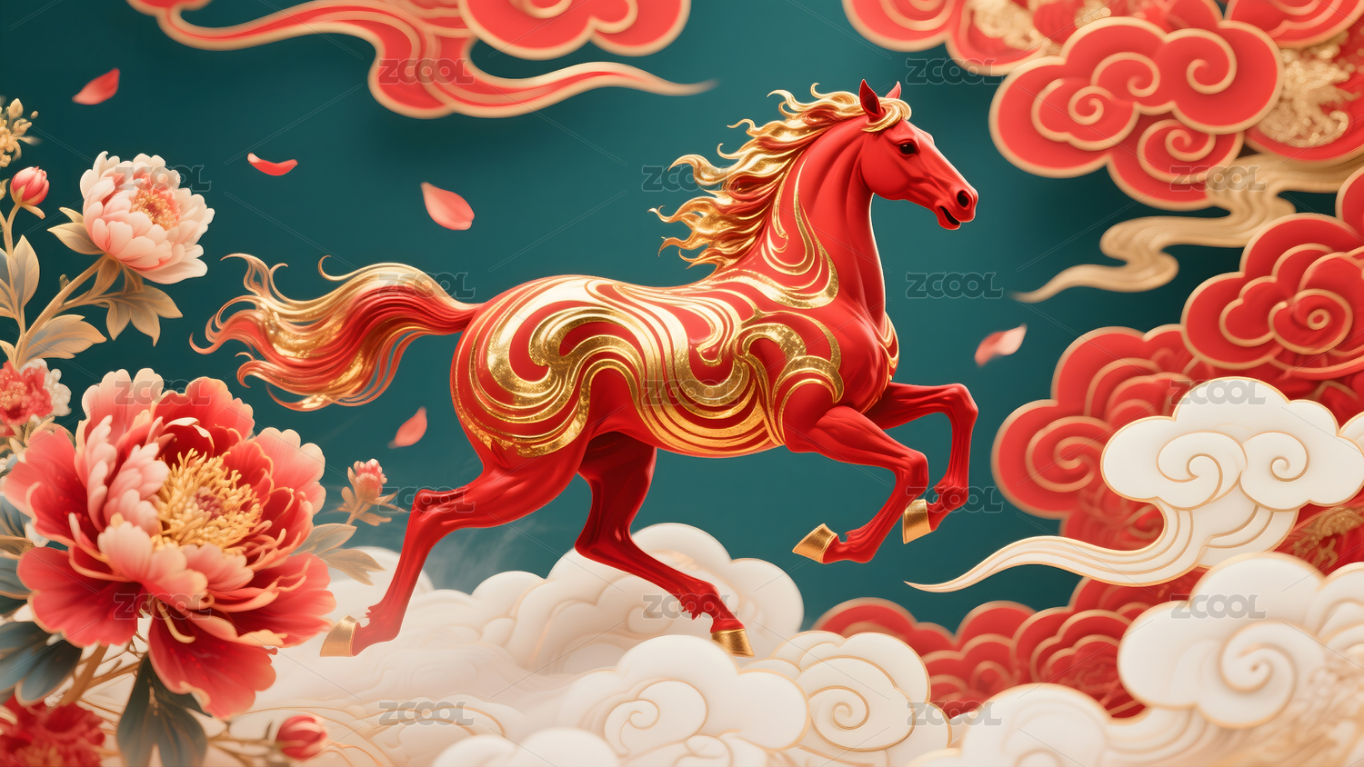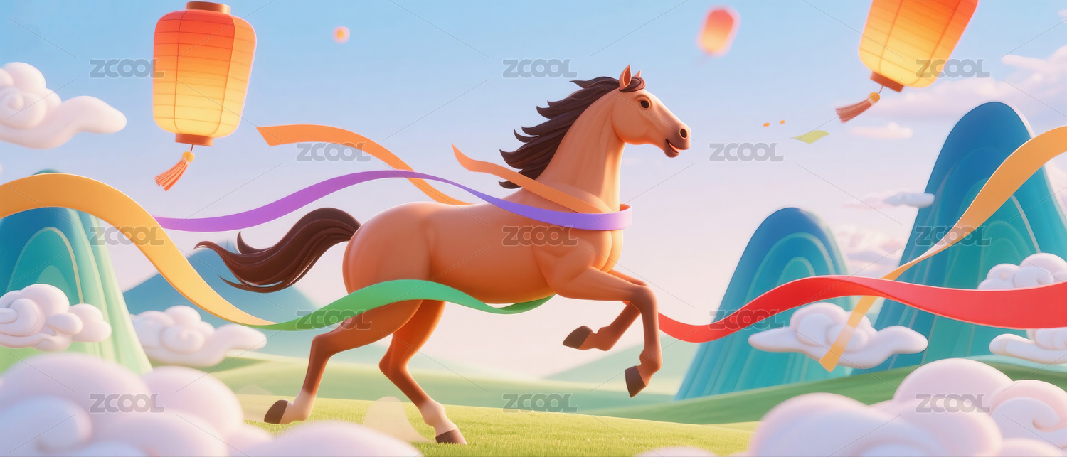 奔马,飘带,山峦,祥云,灯笼,天空,色彩,动态,线条,氛围